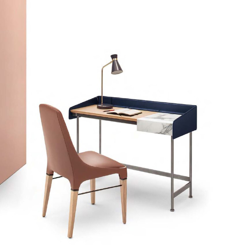 Рабочий письменный или туалетный стол с рамой и внешним краем в лакированной металлической раме или внешним краем в коже, с 3 небольшими хранилищами в коже, совпадающем с внешним краем, деревянным верхом, откидной крышкой для секретного отделения из лакированного дерева или мрамора.
