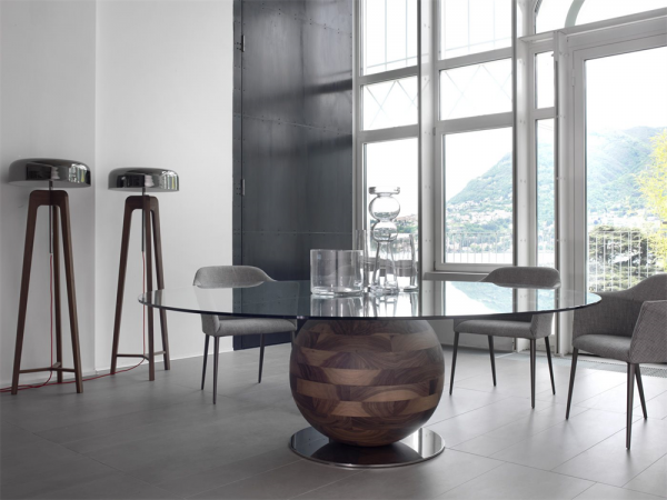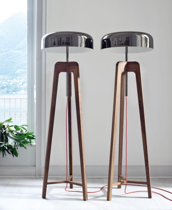 Торшер из массива ореха каналетта или ясеня; а абажур из стекла или металла.