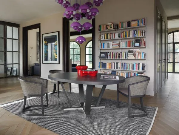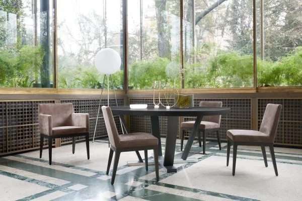 Доступный также в версии с круглой столешницей; стол Aura выделяется деревянной крестообразной опорой и возможностью расширения столешницы в зависимости от необходимости благодаря механизму; скрытому от глаз.