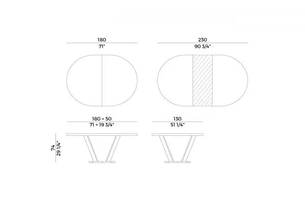 Стол Aura предлагается со структурой дуба; отделки по коллекции; с выдвижной овальной столешницей с сатинированными алюминиевыми профилями.