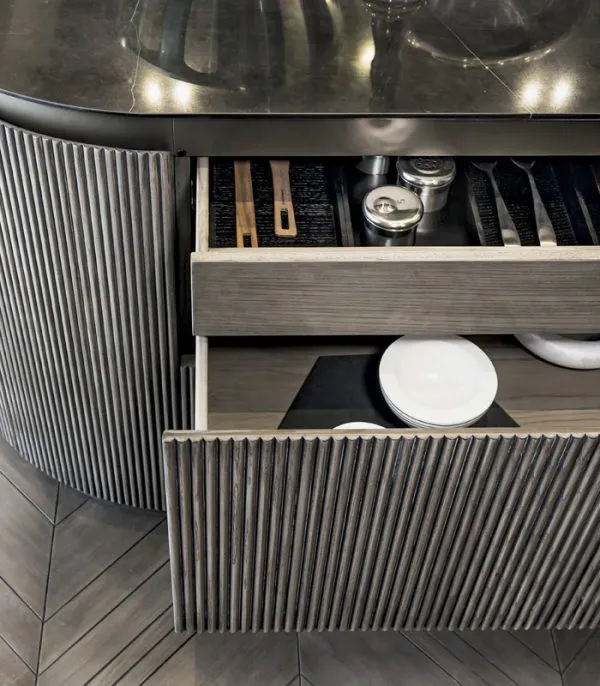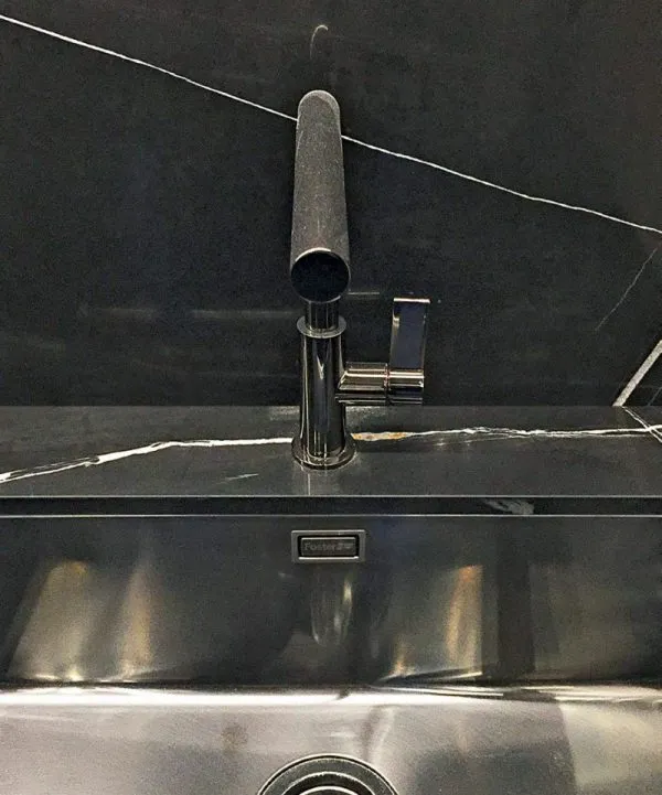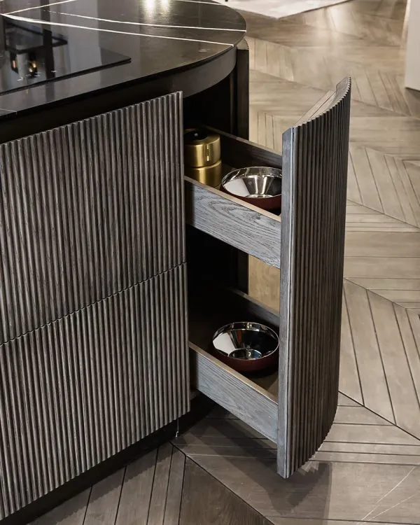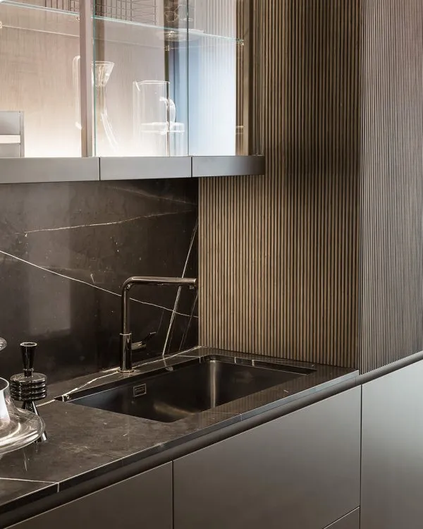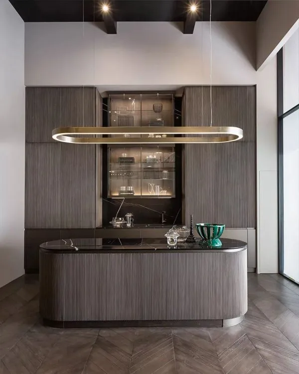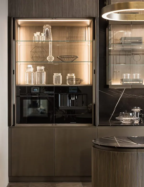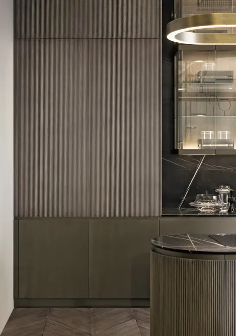 Стильная функциональная линейная кухня с подсветкой в темно-бронзовой отделке. Столешницы выполнены из мрамора оттенка Noir. В композицию входит остров с плитой.