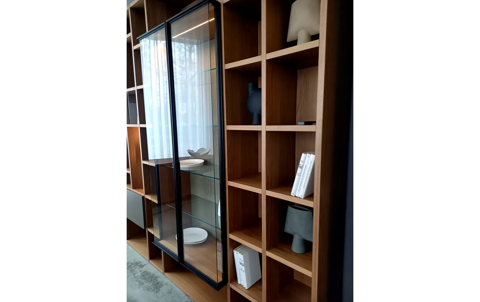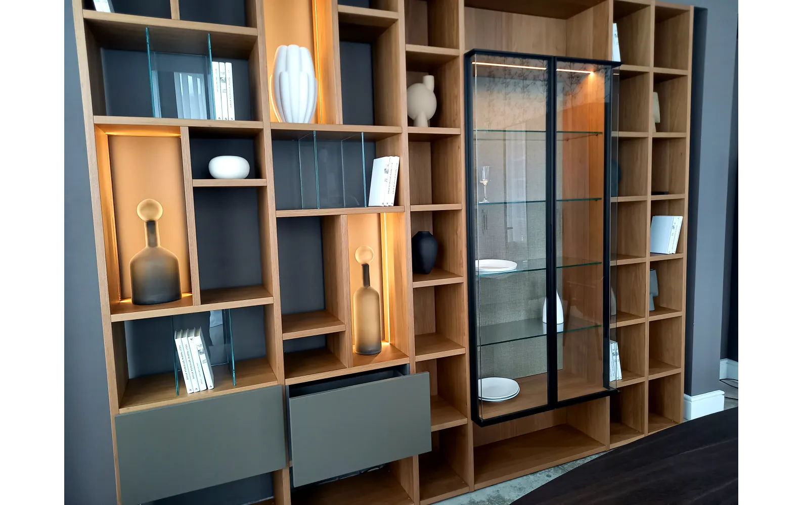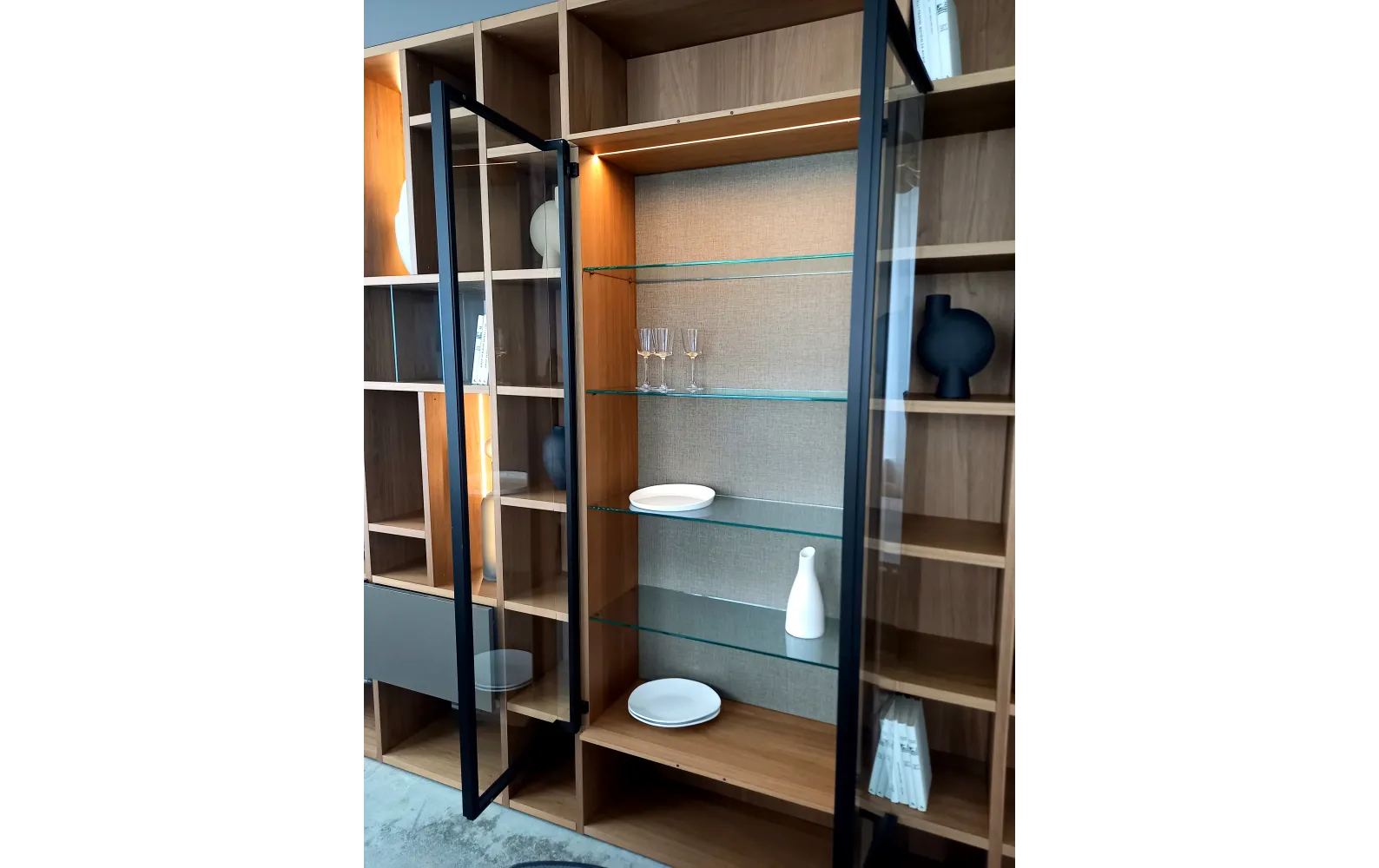 Композиция состоит из открытых секций с полками, системы перегородок из закаленного стекла, выдвижных ящиков для хранения и центральной витрины с выступающими стеклянными дверями с черной рамой из анодированного металла. Задняя панель у витрины декорирована текстилем, а внутренние полки выполнены из закаленного, особо светлого стекла. Композиция оснащена внутренней вертикальной LED-подсветкой для создания акцентов в открытых секциях и горизонтальной подсветкой для витрины. Благодаря продуманному освещению каждый предмет на полках выглядит как музейный экспонат. Система идеально балансирует между хранением и декоративной функцией.