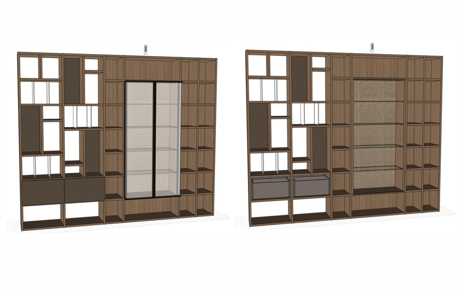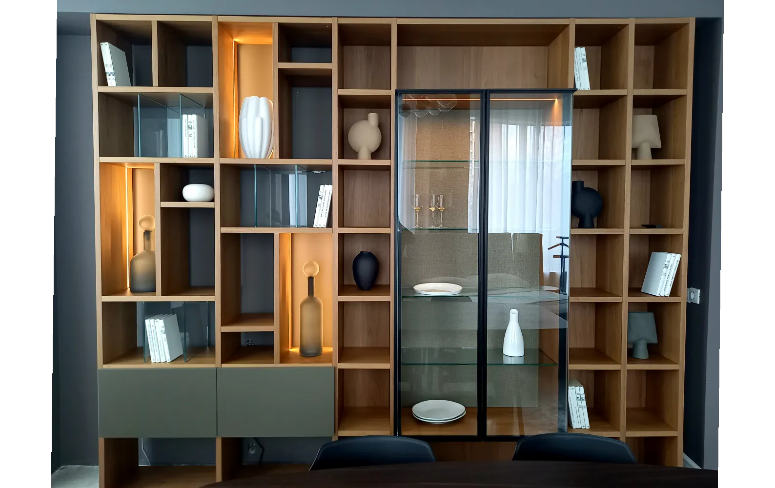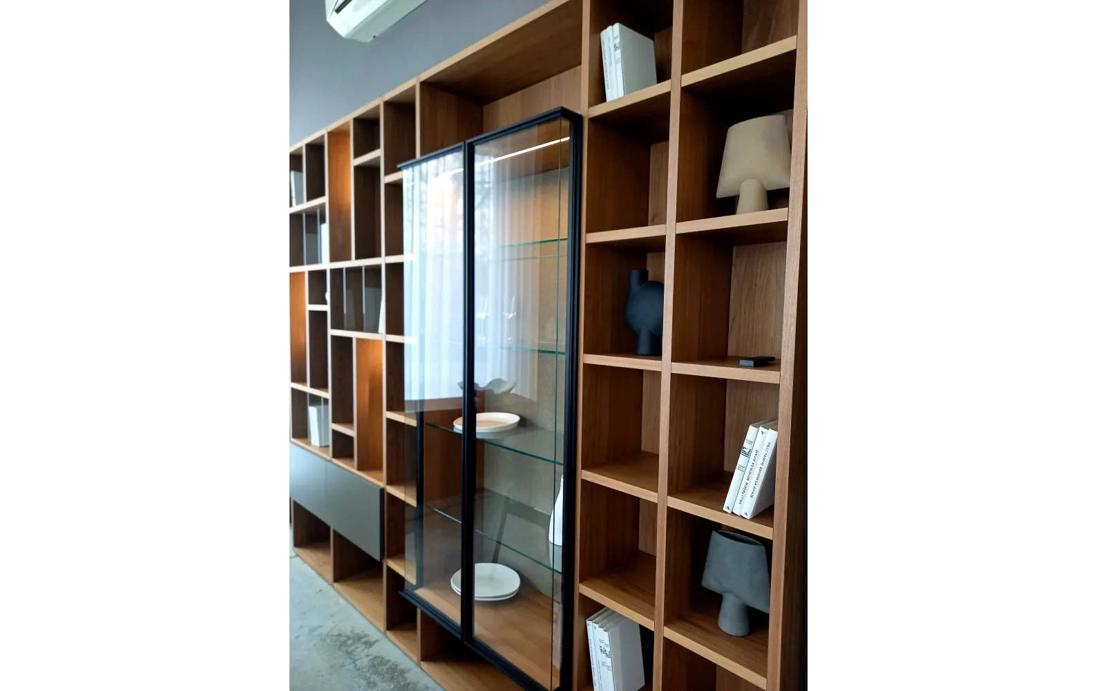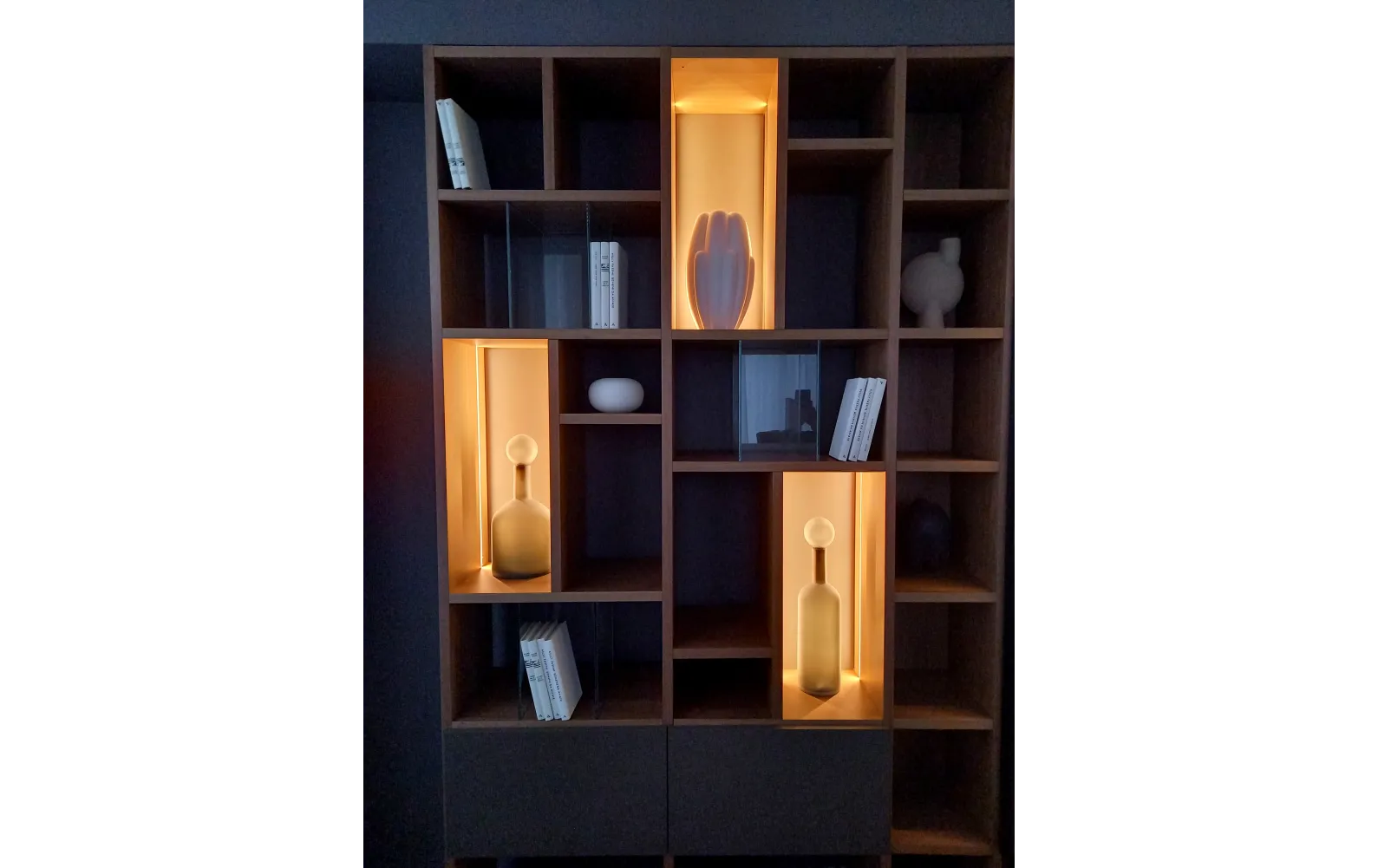 Композиция состоит из открытых секций с полками, системы перегородок из закаленного стекла, выдвижных ящиков для хранения и центральной витрины с выступающими стеклянными дверями с черной рамой из анодированного металла. Задняя панель у витрины декорирована текстилем, а внутренние полки выполнены из закаленного, особо светлого стекла. Композиция оснащена внутренней вертикальной LED-подсветкой для создания акцентов в открытых секциях и горизонтальной подсветкой для витрины. Благодаря продуманному освещению каждый предмет на полках выглядит как музейный экспонат. Система идеально балансирует между хранением и декоративной функцией.