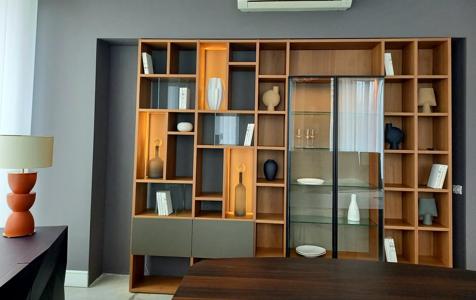 - Функциональность: Комбинация открытых полок для книг и декора + закрытые модули для хранения
