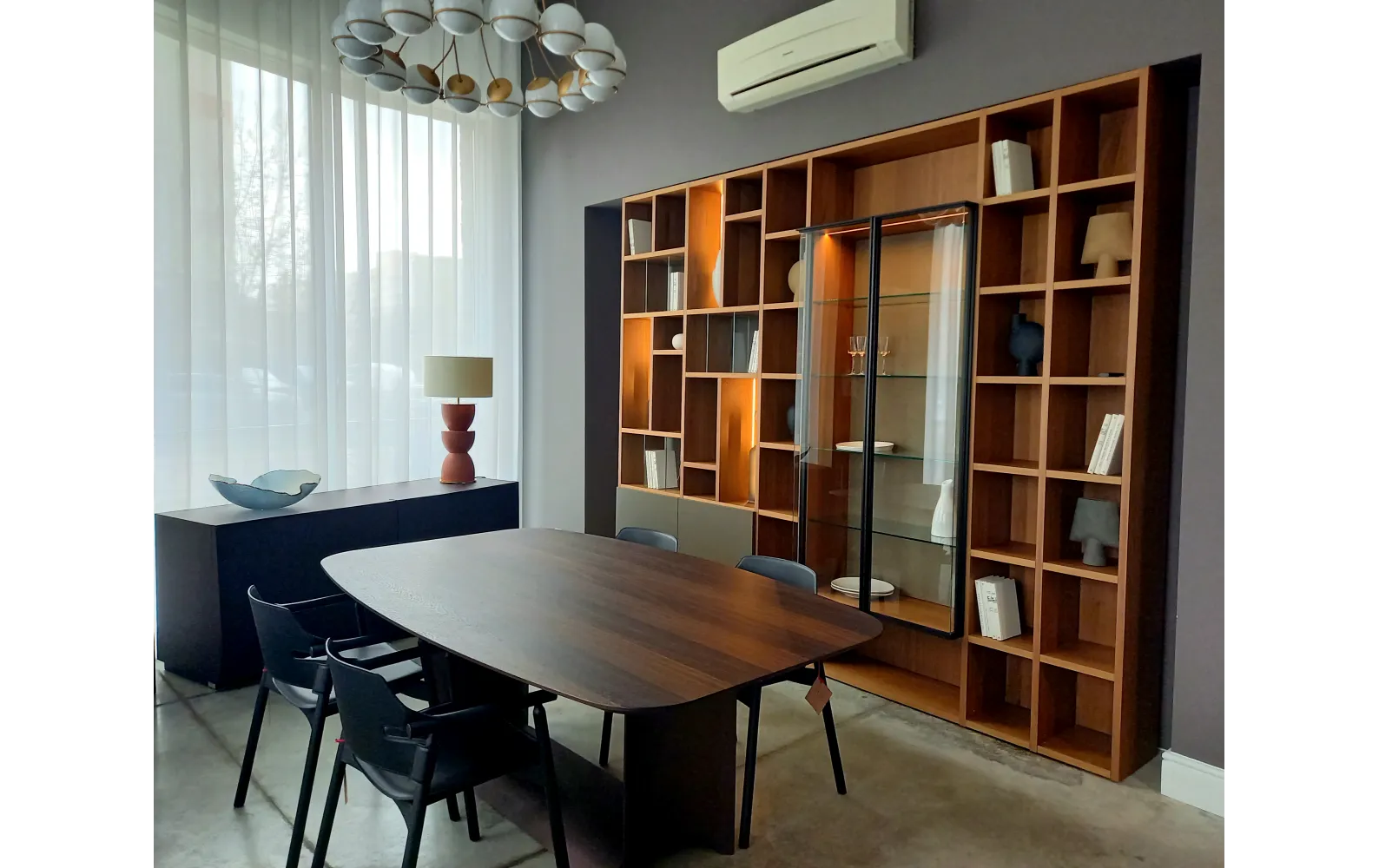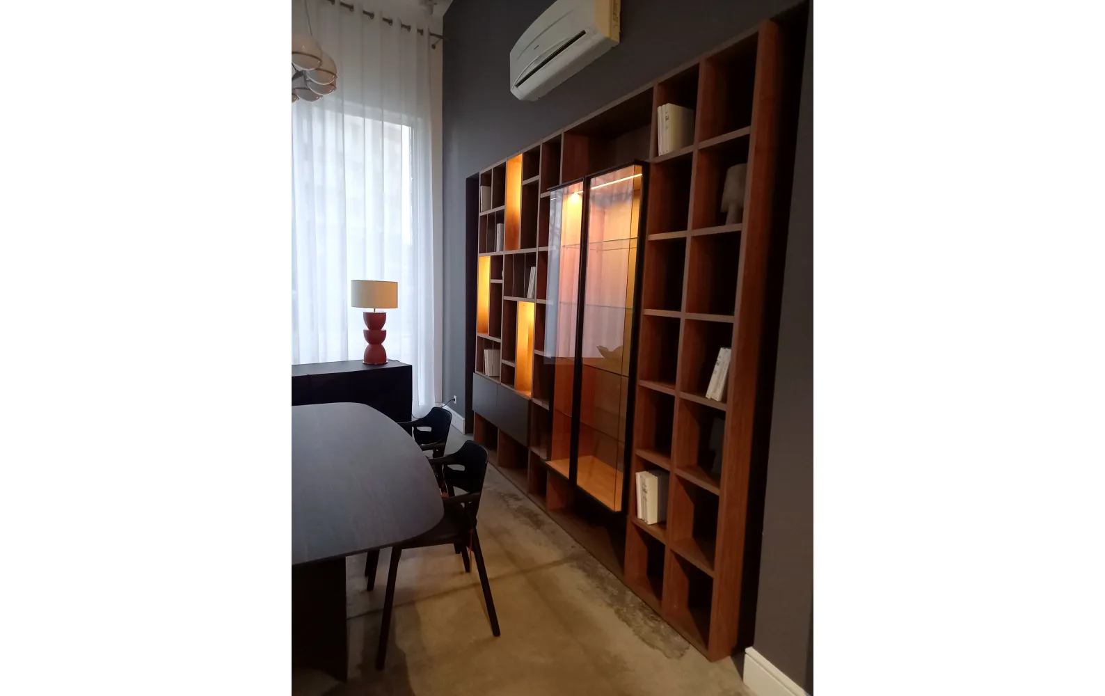 Selecta — это одна из самых выразительных модульных стеновых систем итальянской фабрики Lema, в которой можно создать свою композицию, показав разнообразие материалов, фактур и возможности комбинаций между собой различных систем в единое целое. В представленной экспозиции стеллаж выполнен в особенном шпоне Walnut-L, в тёплом оттенке ореха и достигает высоты потолка, создавая мощный архитектурный акцент.