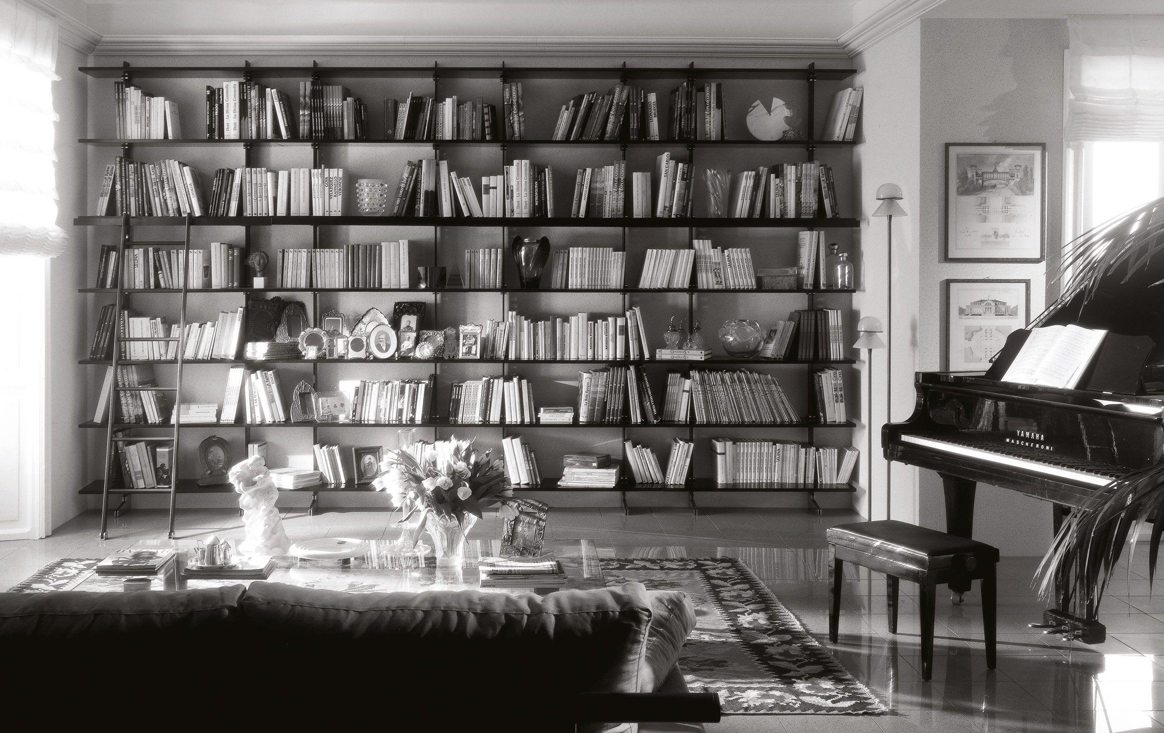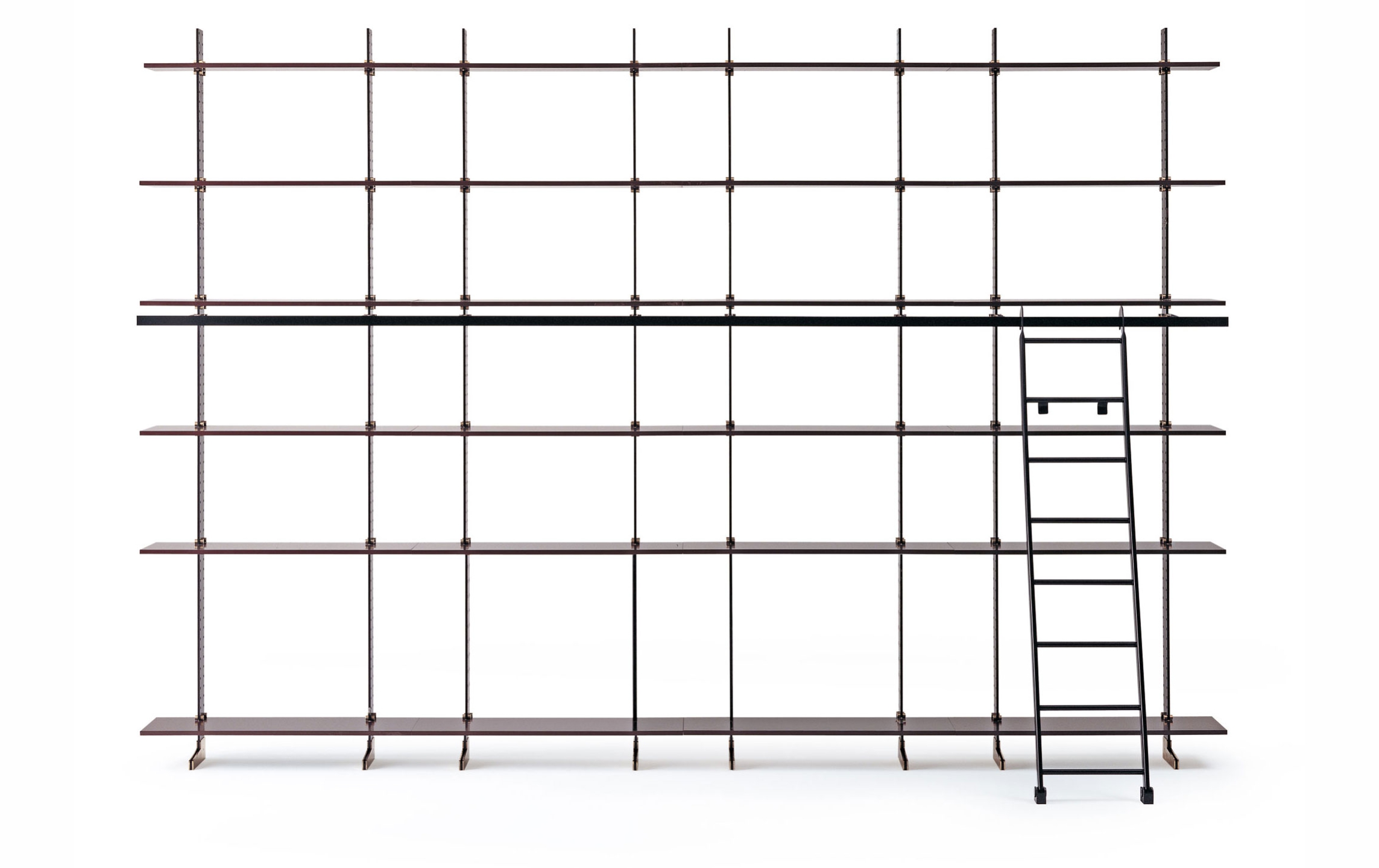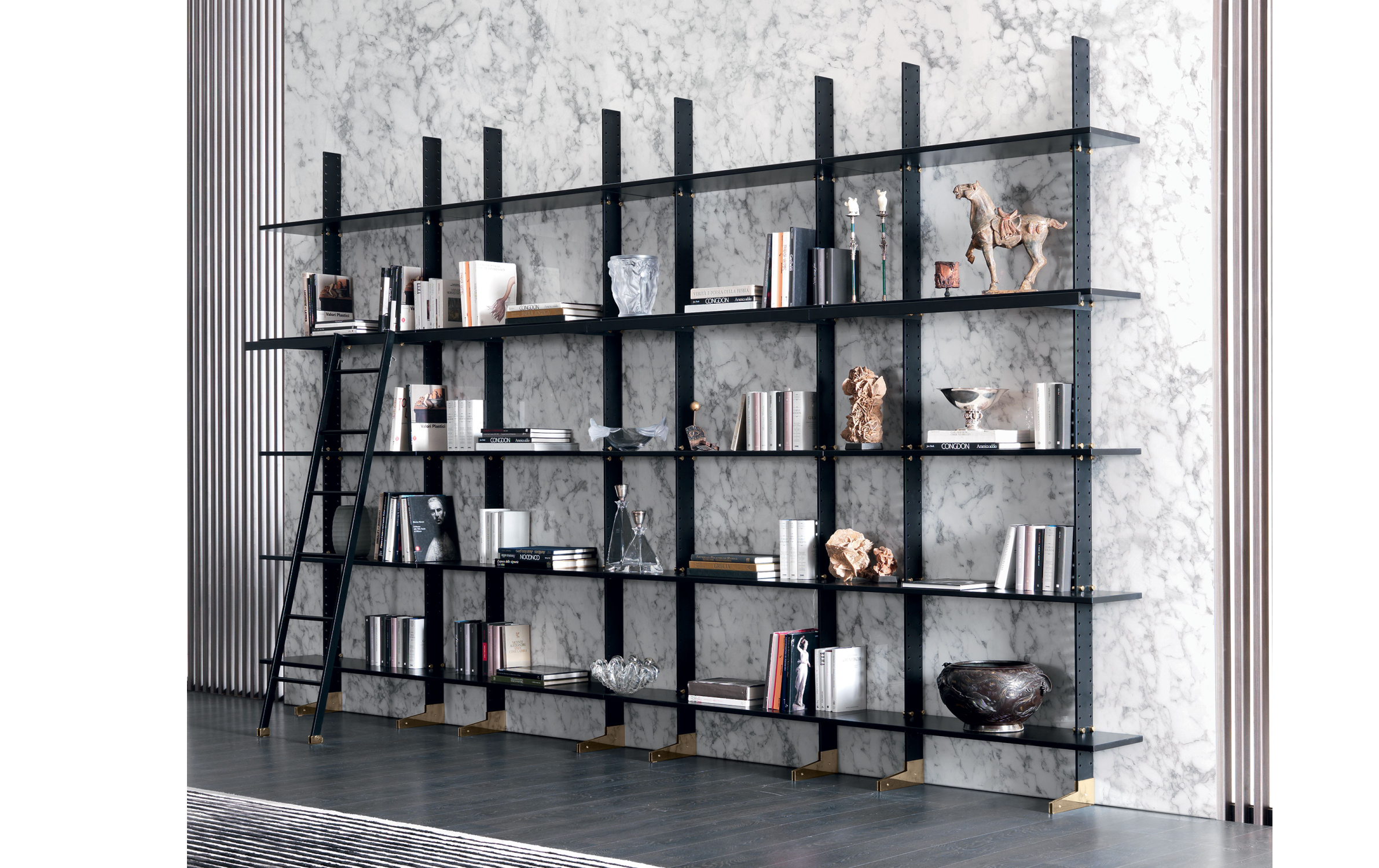 Модульная система Elegie позволяет создавать индивидуальные композиции, адаптированные под различные потребности и размеры помещений. Комбинируя несколько модулей, можно организовать как компактные, так и масштабные системы хранения. Для удобства использования предусмотрена металлическая лестница с черным покрытием и хромированными латунными деталями, облегчающая доступ к верхним полкам.