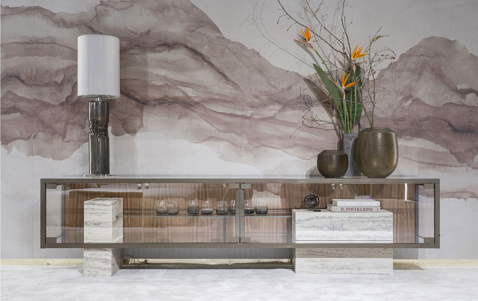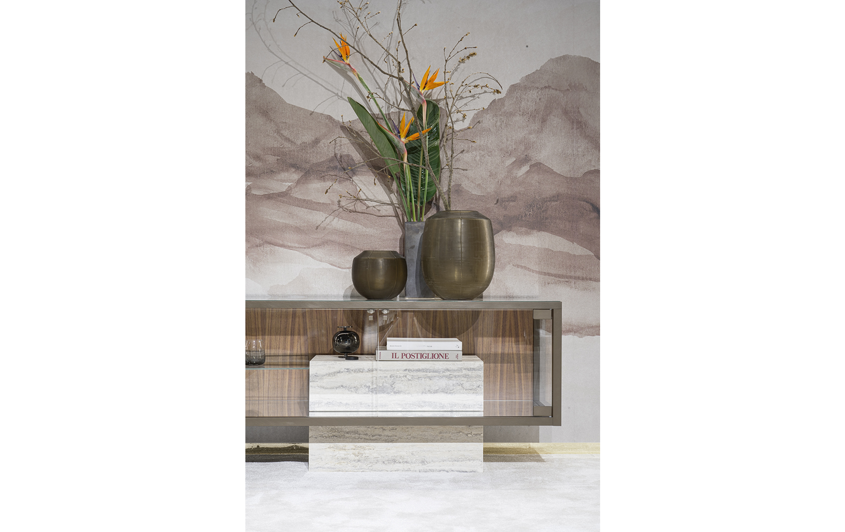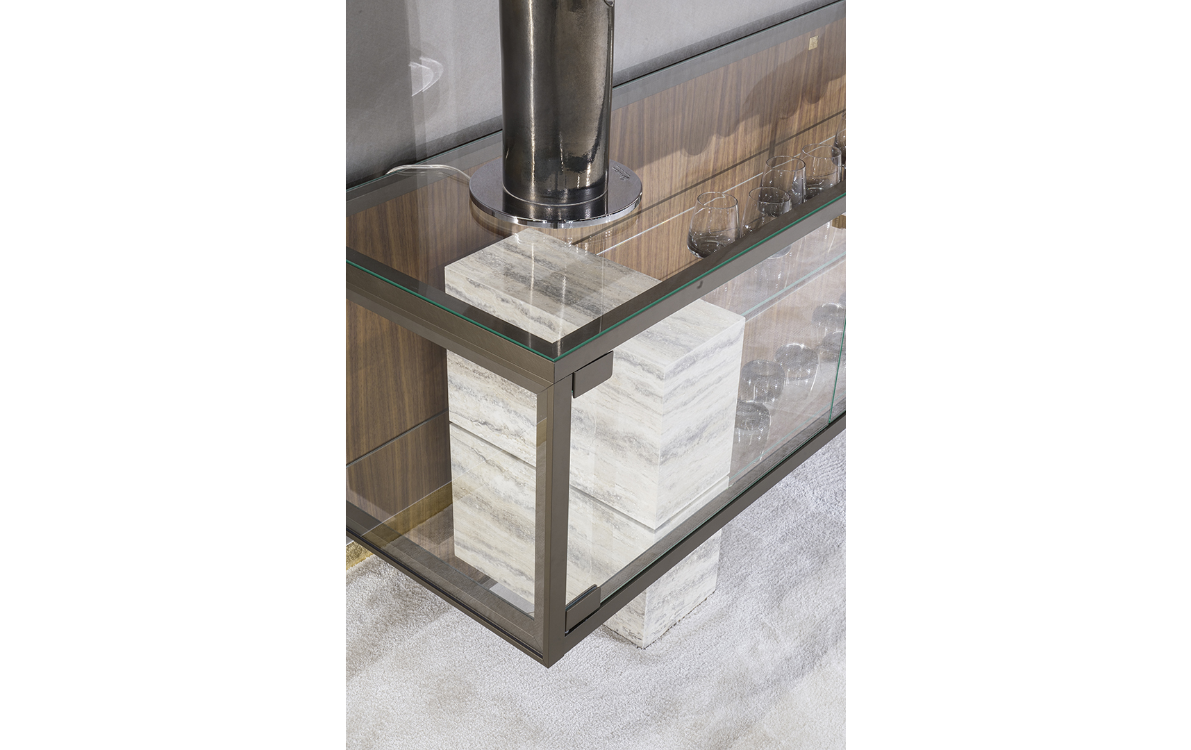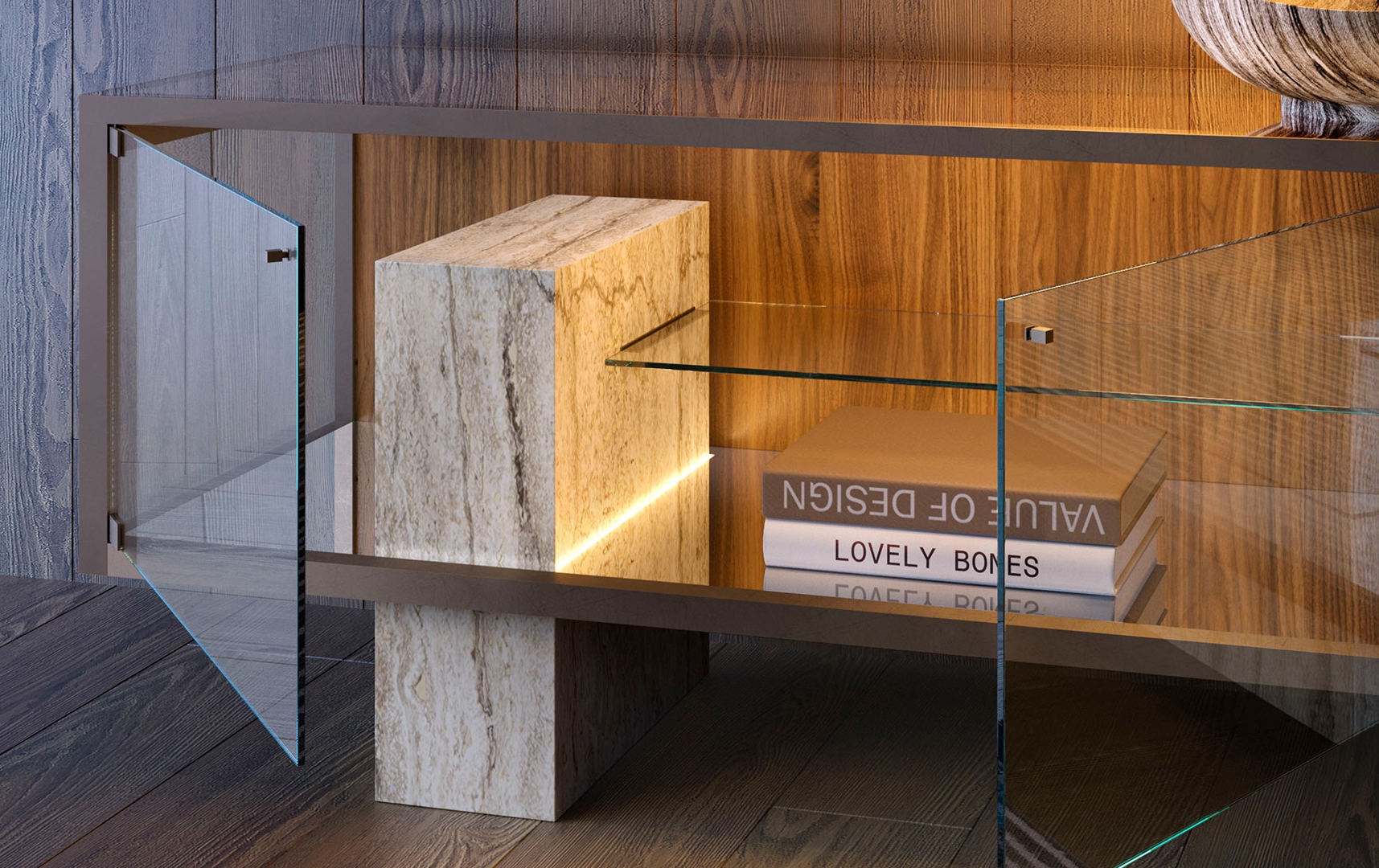 В тумбе Dune сочетание американского ореха и стекла создает изысканную игру отражений. Прочные основания из натурального камня обеспечивают устойчивость и визуальную весомость, создавая баланс заполненных и пустых объемов. Зеркальное дно и встроенная светодиодная подсветка добавляют каждой детали яркости и выразительности.