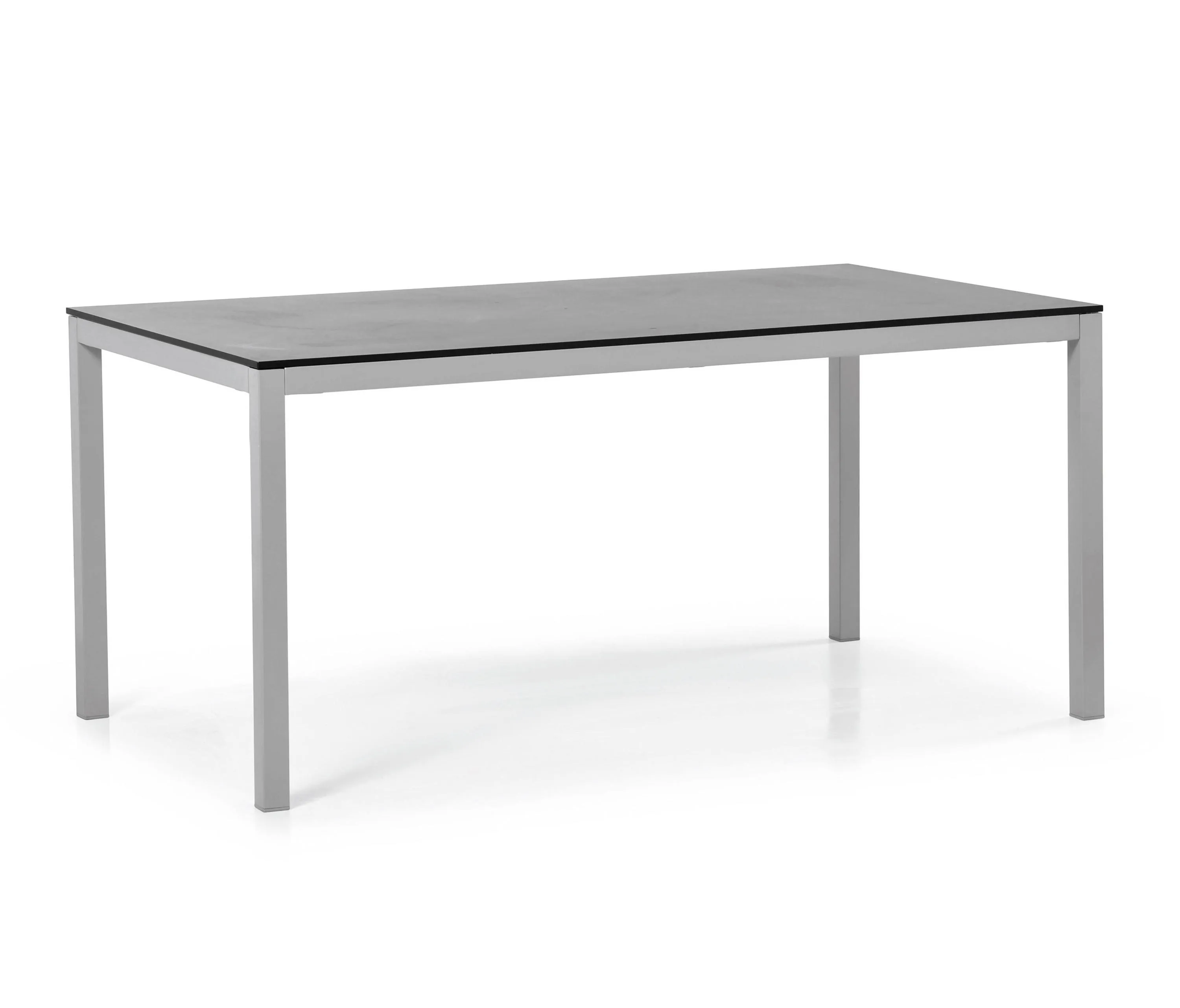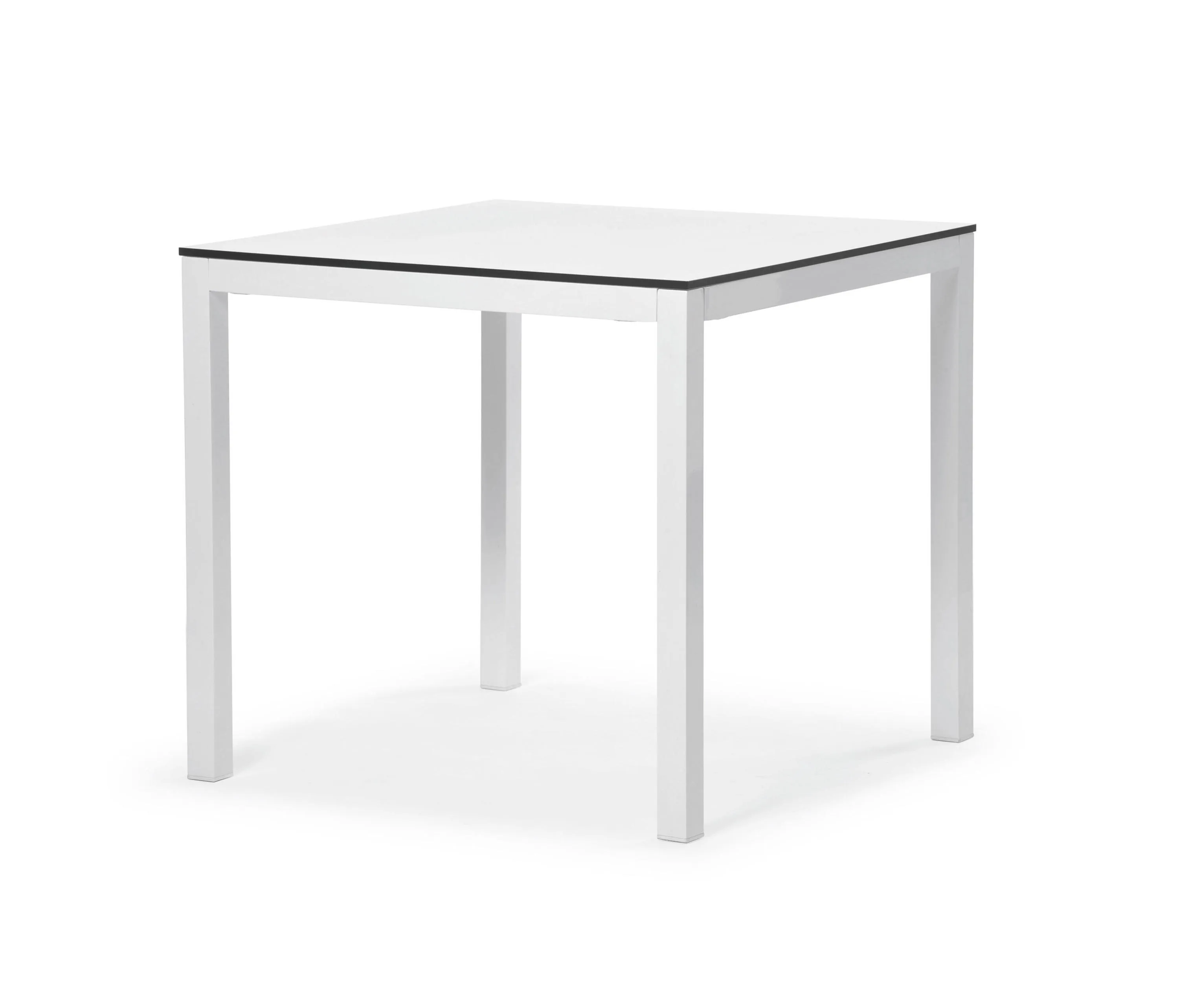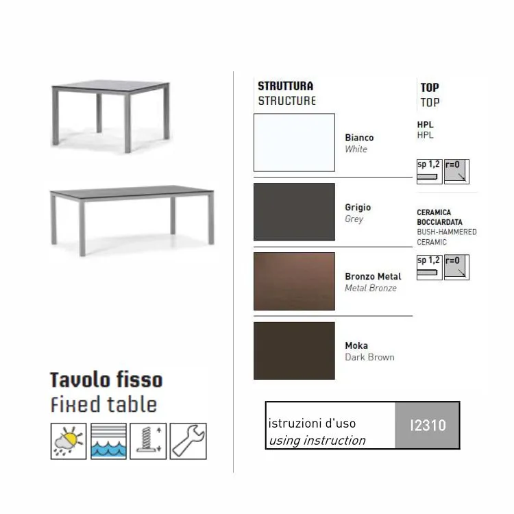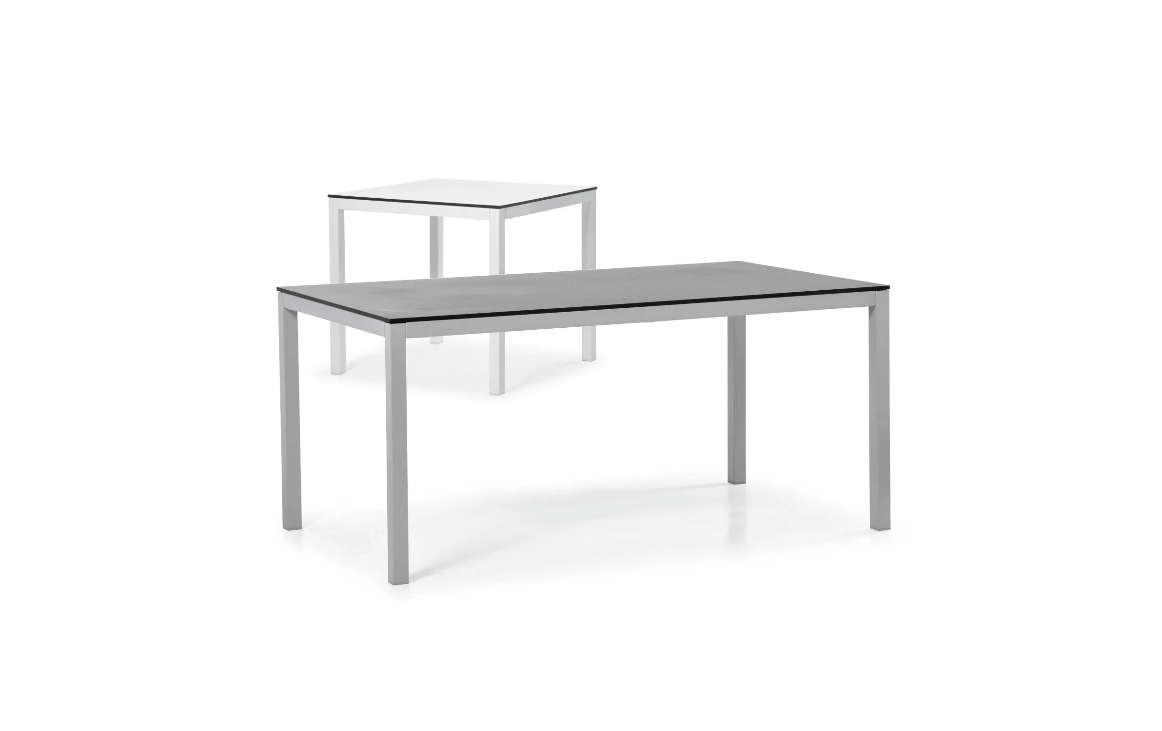 Алюминиевая конструкция с порошковым покрытием со столешницей из HPL или керамики, устойчивая к атмосферным воздействиям и ультрафиолетовому излучению. Основание доступно в сером, белом, шелковом сером, бронзовом, мока. Столешница HPL из белого, антрацитового, шелкового серого, цемента, бедонии, кортеновской или кованой керамики из известково-белого, серого порфира, темного камня. Модель стола доступна с квадратной и прямоугольной столешницей в различных размерах. Доступна также версия в низком исполнении.