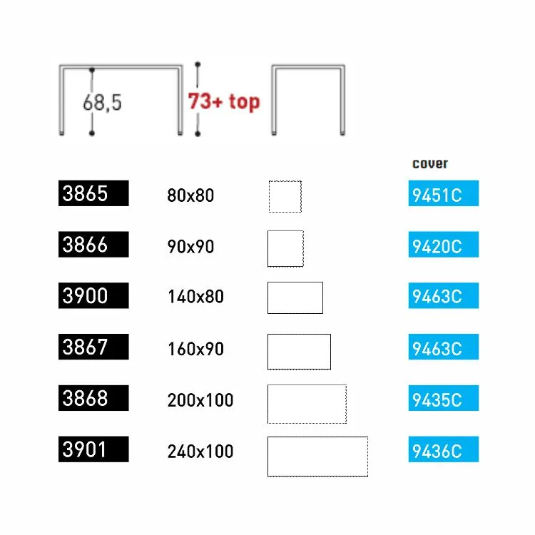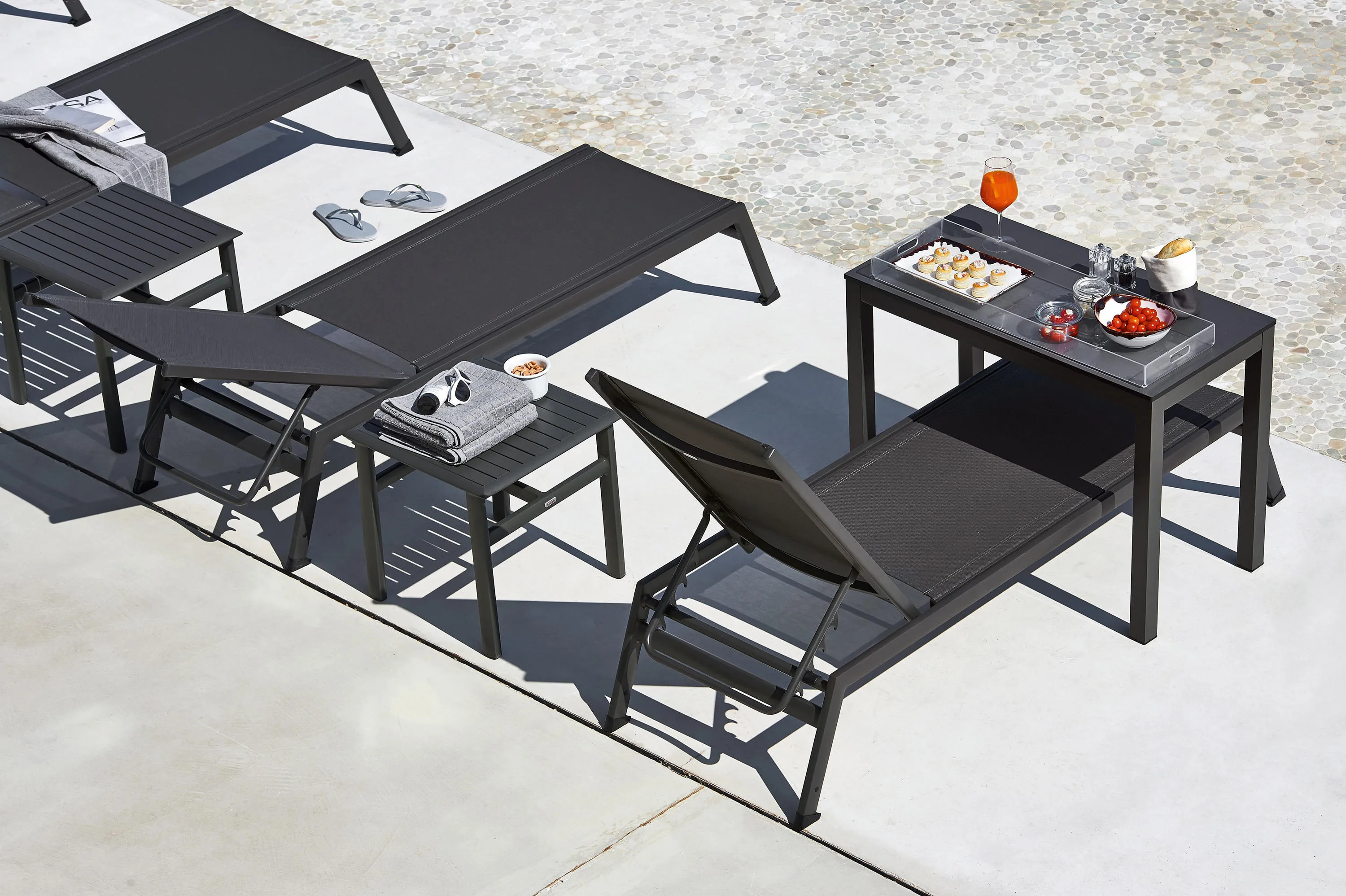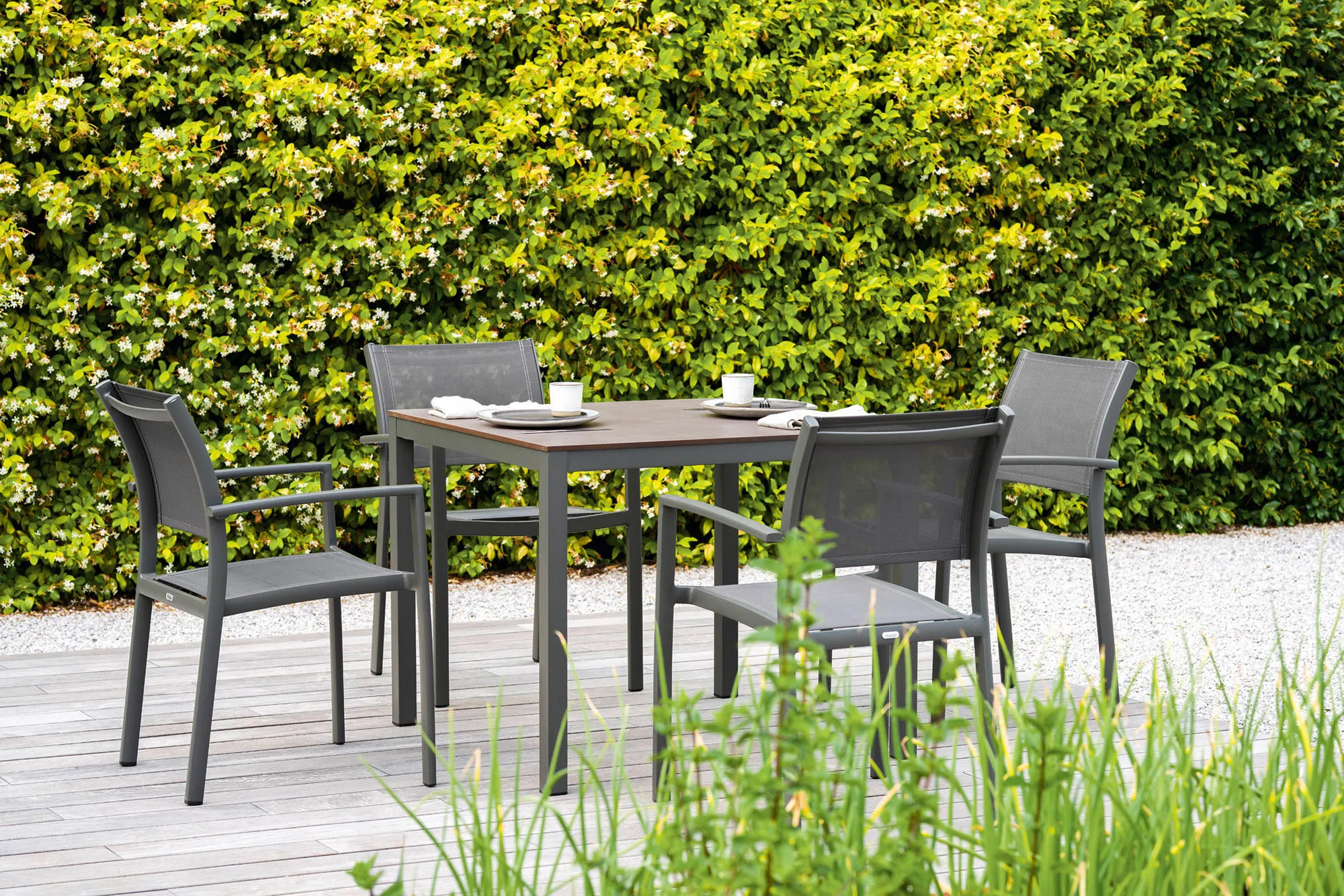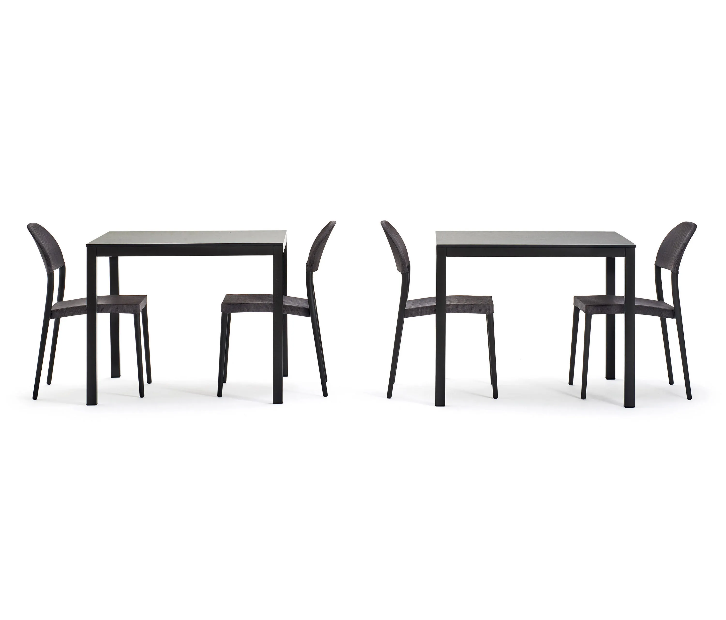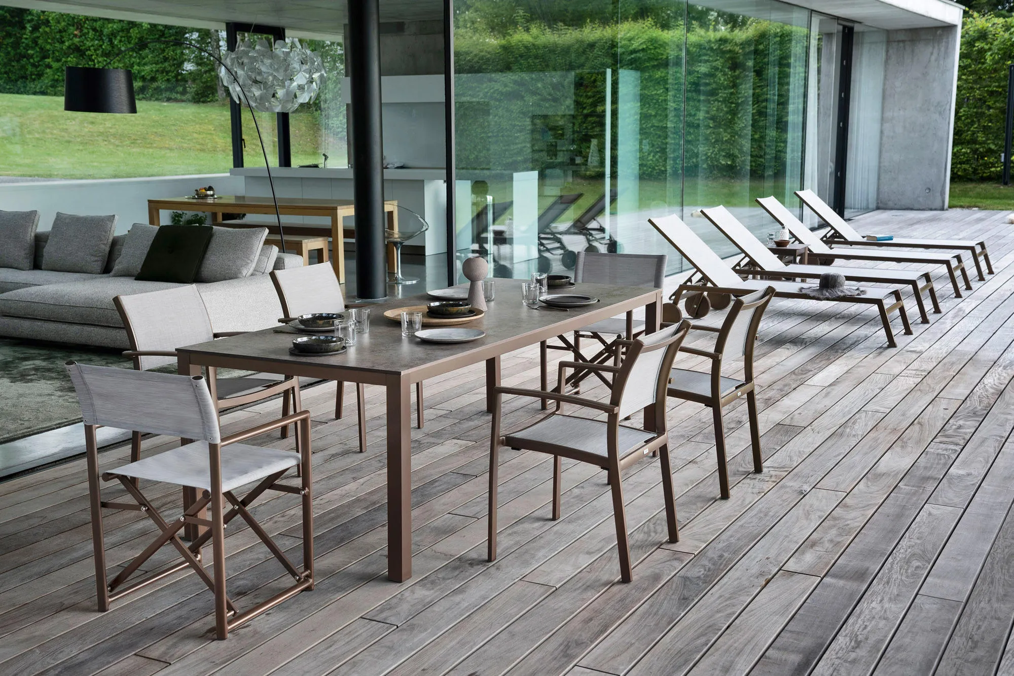 Алюминиевая конструкция с порошковым покрытием со столешницей из HPL или керамики, устойчивая к атмосферным воздействиям и ультрафиолетовому излучению. Основание доступно в сером, белом, шелковом сером, бронзовом, мока. Столешница HPL из белого, антрацитового, шелкового серого, цемента, бедонии, кортеновской или кованой керамики из известково-белого, серого порфира, темного камня. Модель стола доступна с квадратной и прямоугольной столешницей в различных размерах. Доступна также версия в низком исполнении.