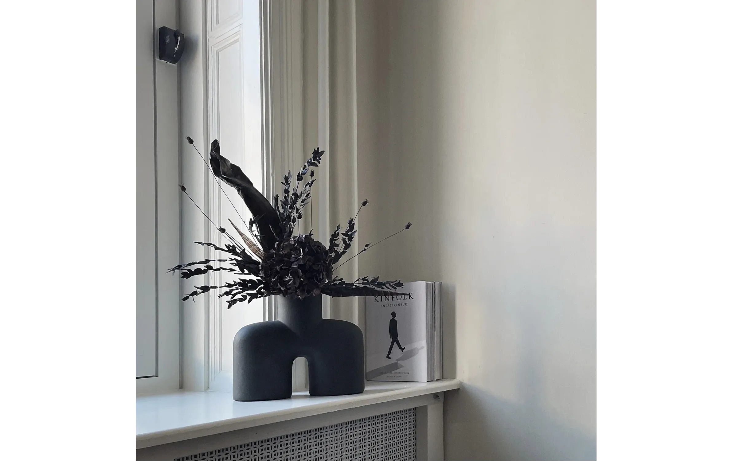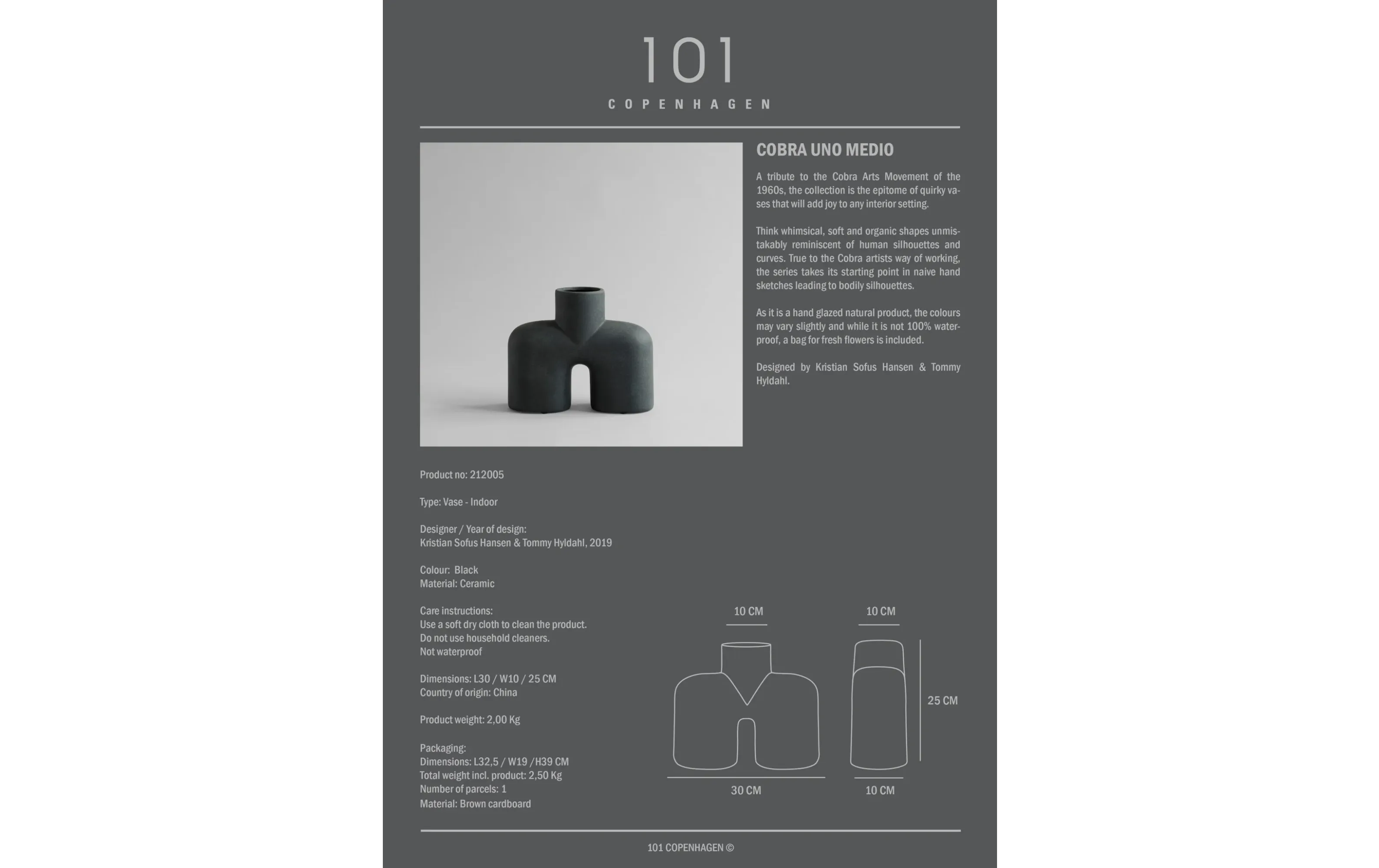 Cobra Medio Black от 101 Copenhagen — это не просто ваза, а выразительный арт-объект, вдохновлённый эстетикой движения CoBrA 1960-х годов. Её форма напоминает человеческий силуэт, сочетая в себе мягкие, органичные линии и архитектурную строгость. Дизайн, разработанный Кристианом Софусом Хансеном и Томми Хюльдалем, превращает функциональный предмет в элемент современного искусства. Изготовленная вручную из керамики и покрытая чёрной матовой глазурью, ваза обладает уникальной текстурой, напоминающей замшу. Каждое изделие индивидуально, благодаря ручной отделке и особенностям глазурования. Ваза не является водонепроницаемой, но в комплект входит специальный пакет для свежих цветов.