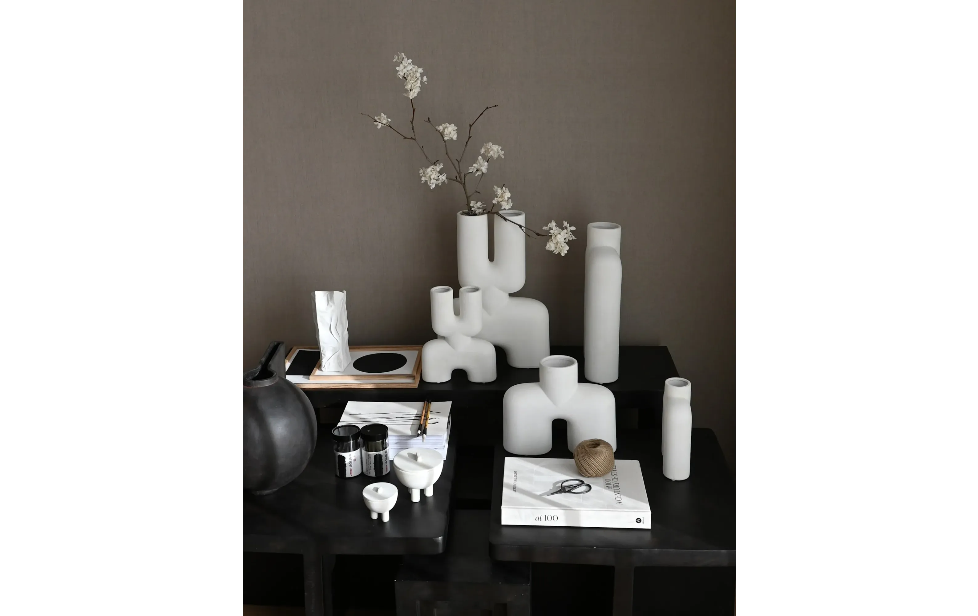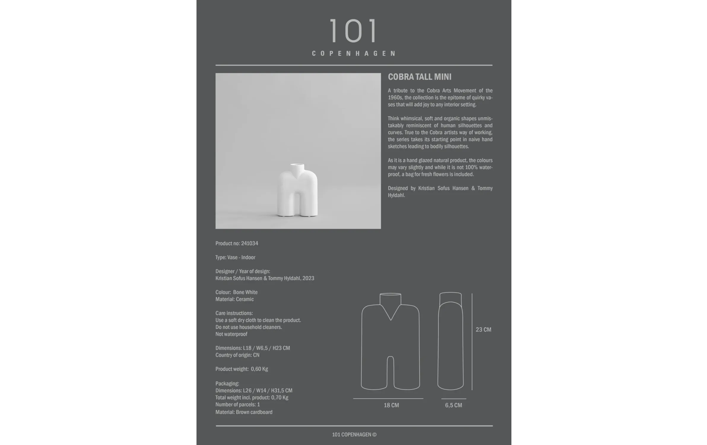 Cobra Tall Mini Bone White от 101 Copenhagen — это не просто ваза, а выразительный арт-объект, вдохновлённый эстетикой движения CoBrA 1960-х годов. Её форма напоминает человеческий силуэт, сочетая в себе мягкие, органичные линии и архитектурную строгость. Дизайн, разработанный Кристианом Софусом Хансеном и Томми Хюльдалем, превращает функциональный предмет в элемент современного искусства. Изготовленная вручную из керамики и покрытая белой матовой глазурью, ваза обладает уникальной текстурой, напоминающей замшу. Каждое изделие индивидуально, благодаря ручной отделке и особенностям глазурования. Ваза не является водонепроницаемой, но в комплект входит специальный пакет для свежих цветов.