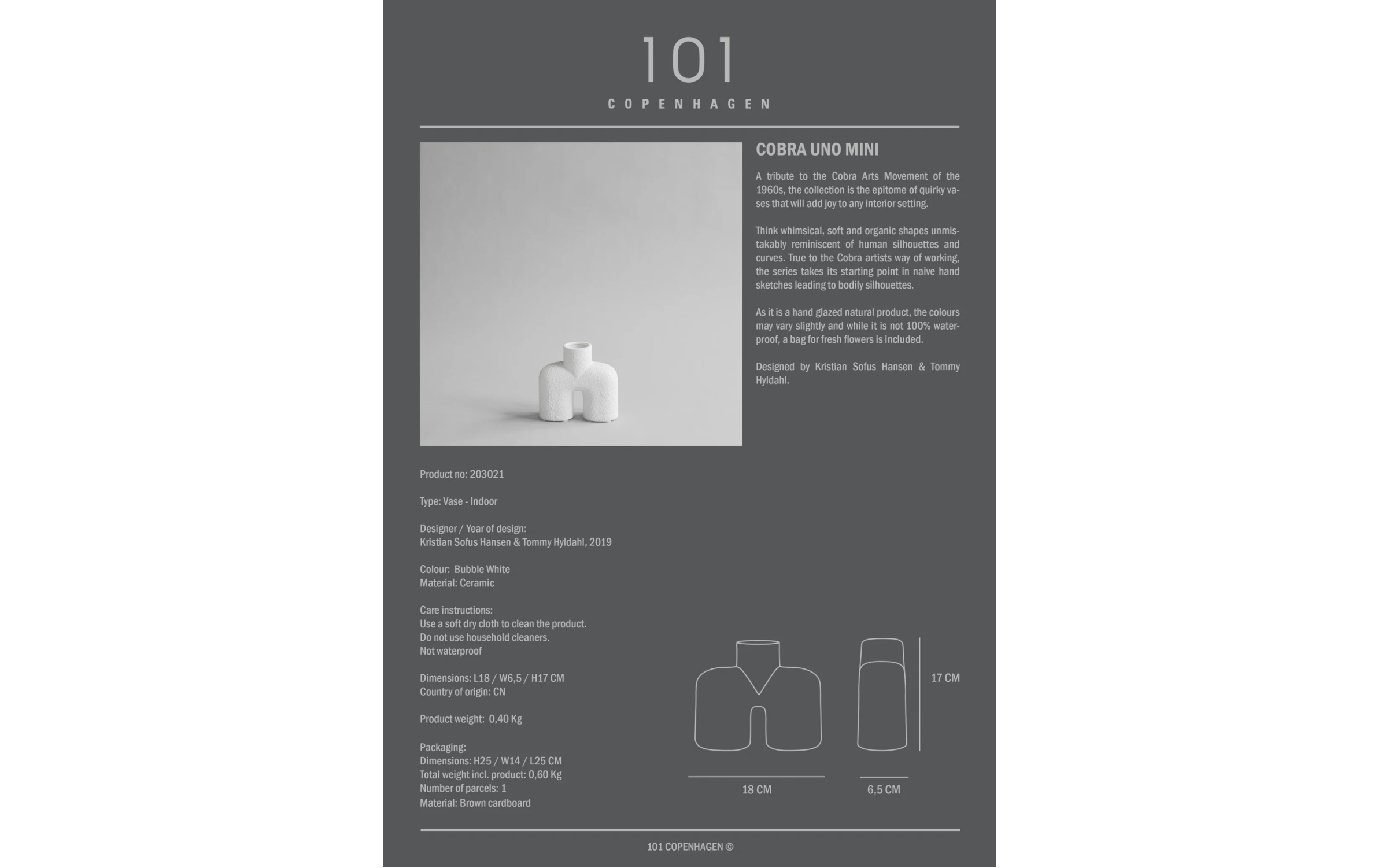 Cobra Mini Bubble White от 101 Copenhagen — это не просто ваза, а выразительный арт-объект, вдохновлённый эстетикой движения CoBrA 1960-х годов. Её форма напоминает человеческий силуэт, сочетая в себе мягкие, органичные линии и архитектурную строгость. Дизайн, разработанный Кристианом Софусом Хансеном и Томми Хюльдалем, превращает функциональный предмет в элемент современного искусства. Изготовленная вручную из керамики и покрытая белой матовой глазурью с пузырчатой текстурой, ваза обладает уникальной фактурой, напоминающей замшу. Каждое изделие индивидуально, благодаря ручной отделке и особенностям глазурования. Ваза не является водонепроницаемой и предназначена для сухоцветов или декоративного использования.