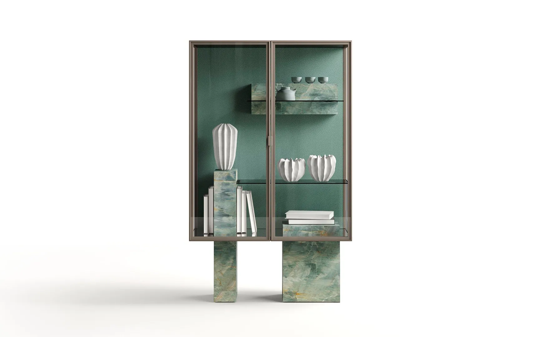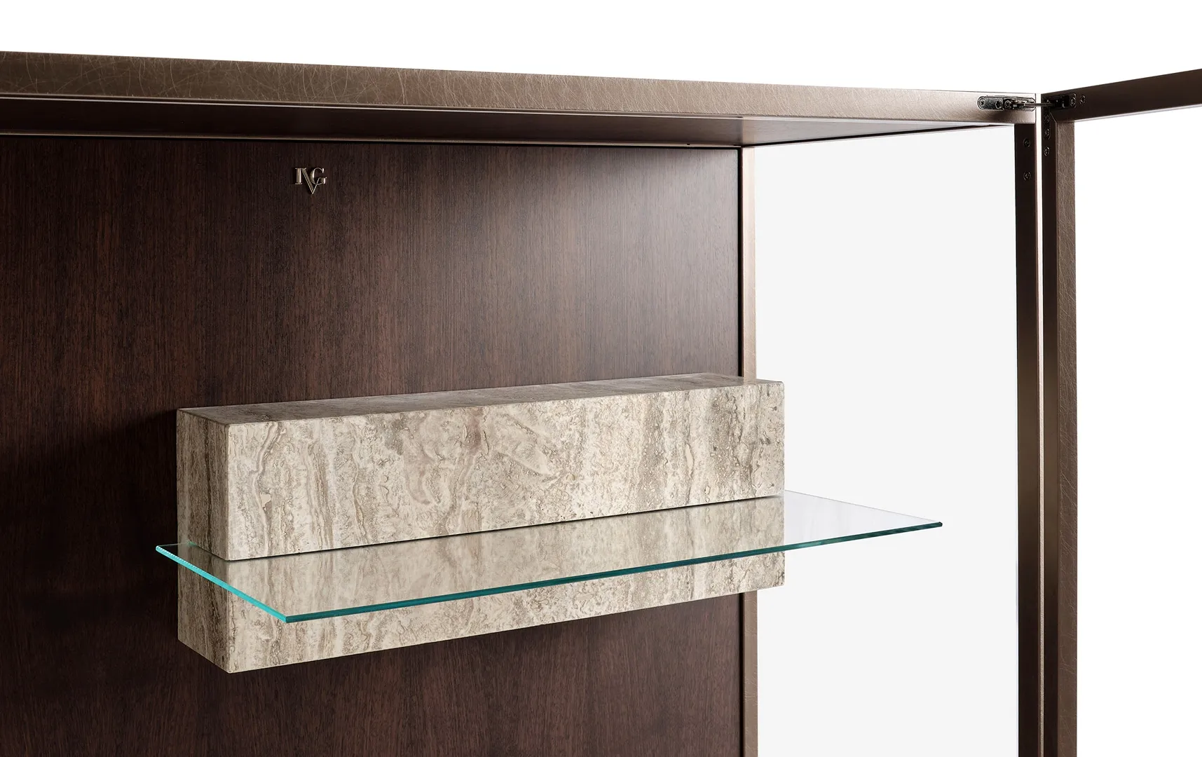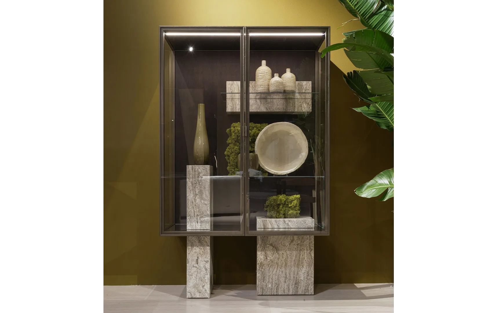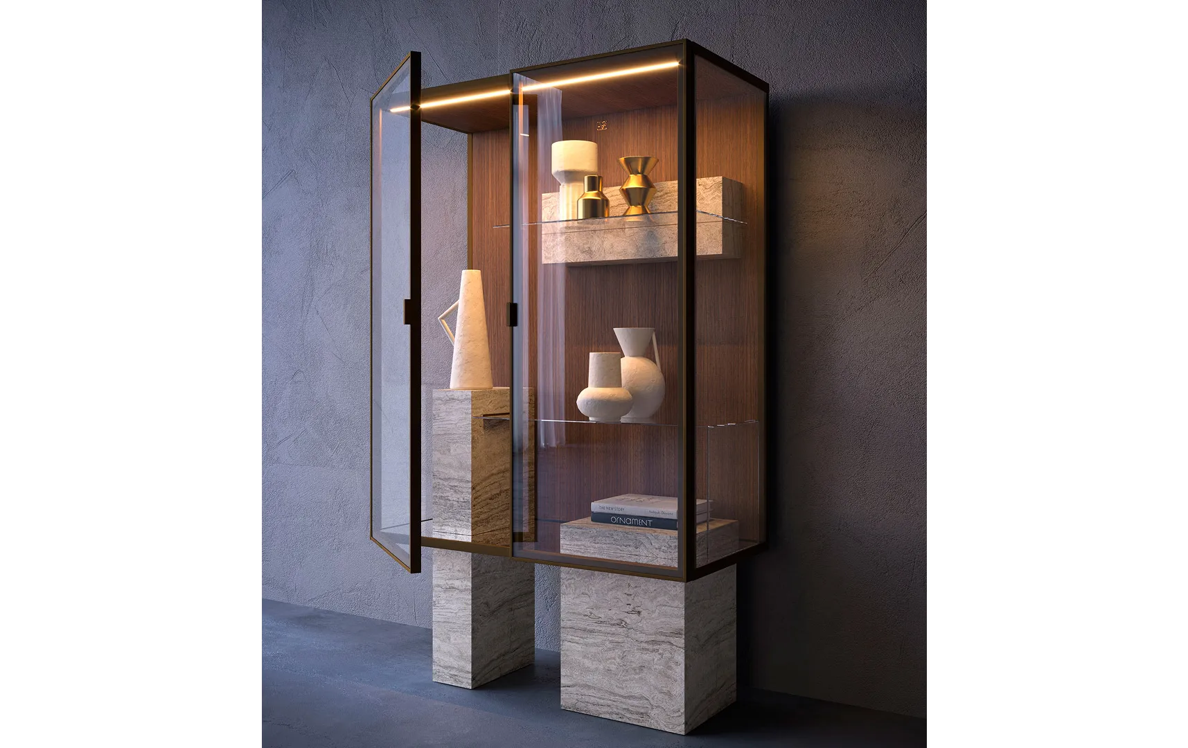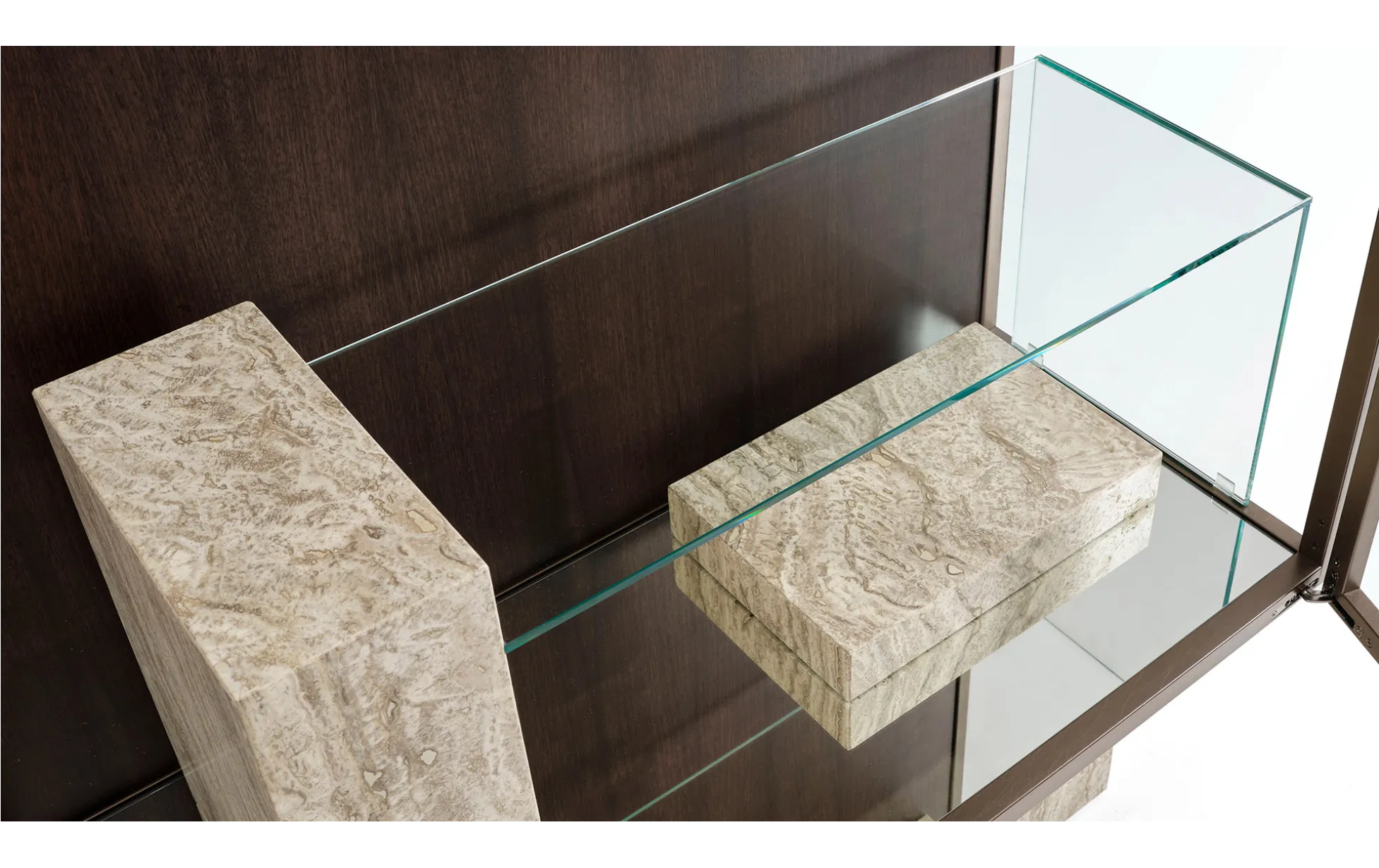Витрина Dune построена вокруг точного соединения: в паз, вырезанный в каменном основании, легко и гармонично вписывается прозрачная полка. Результат – идеальный баланс прочности и легкости, пустоты и заполненности.