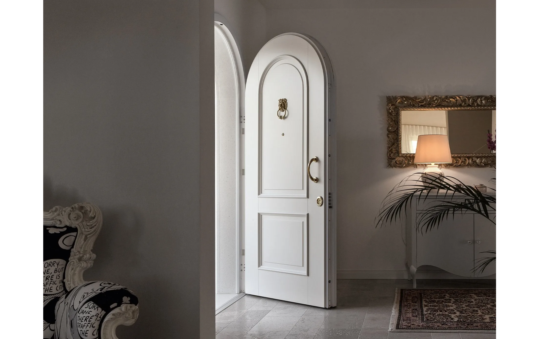 Входная дверь EVOLUTION от Oikos — это арочная безопасная дверь с видимыми петлями, которая сочетает в себе изысканный итальянский дизайн и архитектурную выразительность. Ее изогнутая форма и высококачественные материалы создают элегантный вход, который станет настоящим украшением вашего дома. Эта модель может быть дополнена боковыми панелями или фрамугой, а также изготовлена по индивидуальным чертежам заказчика, что делает ее идеальным решением для тех, кто ценит уникальность.