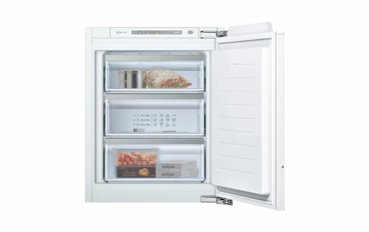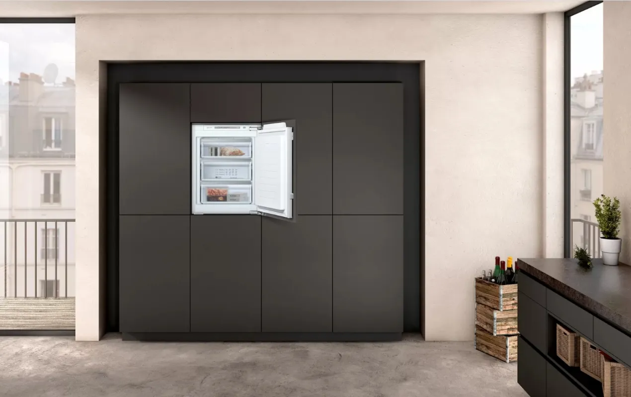 Встраиваемый морозильник Neff вместимостью 72 л вписывается как в большую, так и в маленькую кухню. В камере 3 пластиковых выдвижных ящика, вы можете хранить продукты с легкой и суперзаморозкой. Каждое отделение со своим климатом, вы можете управлять им на специальной панели.