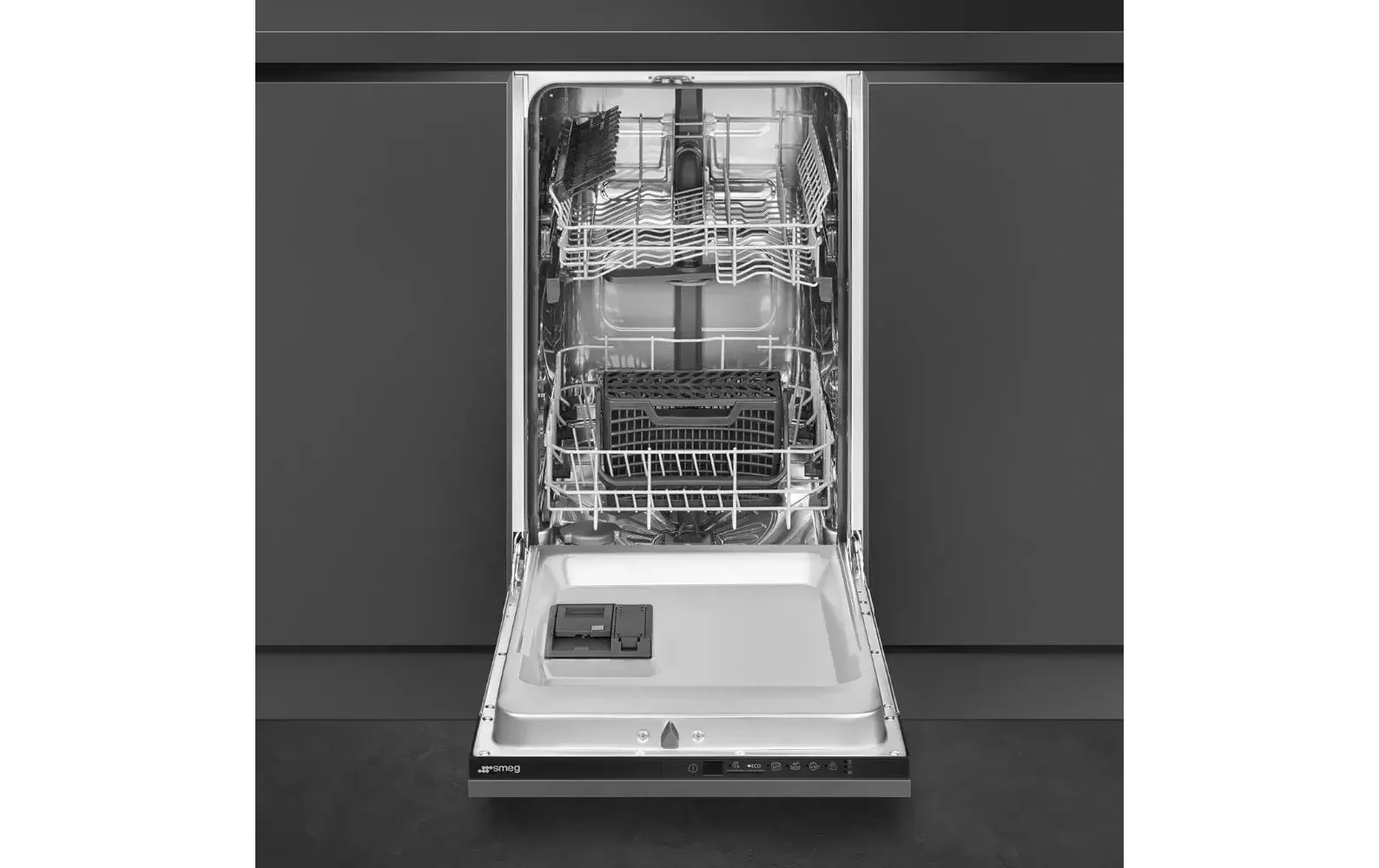 Встраиваемая посудомоечная машина Smeg ST4512IN — узкая модель шириной 45 см для установки в малогабаритной кухне. Она рассчитана на одновременную мойку 9 комплектов посуды — в каждый комплект входят глубокая и мелкая тарелки, салатник, чашка с блюдцем, вилка и ложка. На фронтальную часть машины может быть установлен мебельный фасад весом не более 7,5 кг на скользящих петлях. Рабочая камера и фильтр изготовлены из нержавеющей стали, а дверца — из оцинкованной стали. Для защиты от протечек в посудомоечной машине Смег ST4512IN предусмотрена система «полный Aquastop». Имеется возможность подключения к горячей воде — экономия электроэнергии при этом может составить до 35%.
