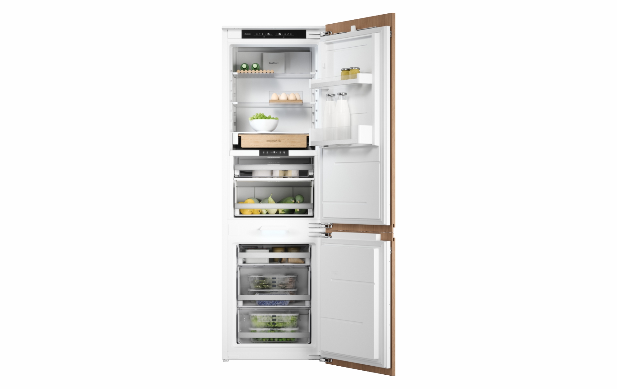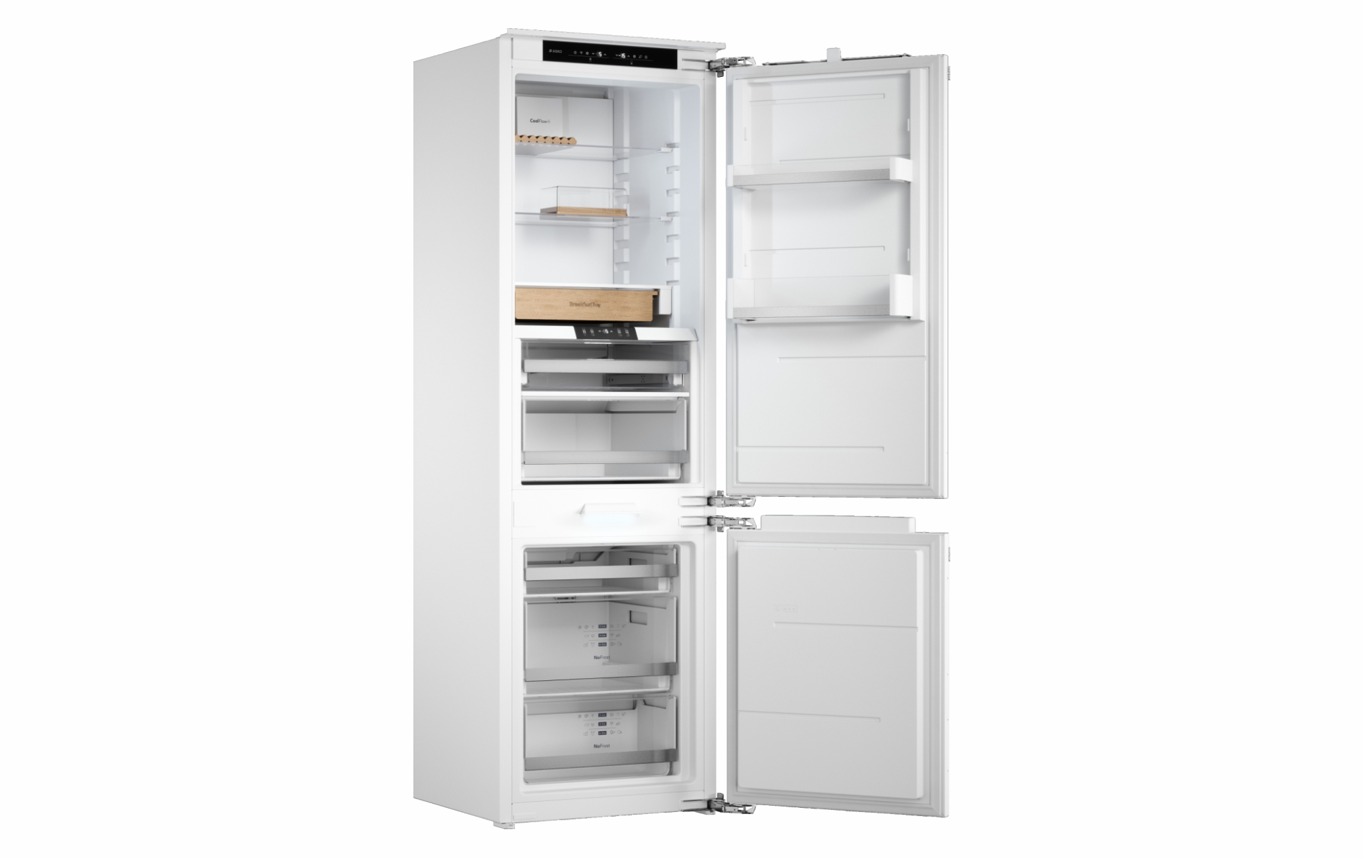 Встраиваемый двухкамерный холодильник с большим объемом 226 л и перенавешиваемыми дверьми. Удобное сенсорное управление позволяет легко устанавливать нужную температуру. Система No Frost устраняет необходимость в разморозке, а также экономит электроэнергию. Зона свежести DuraFresh™ с независимым температурным режимом создает идеальный микроклимат для хранения мяса, рыбы и овощей. Адаптивный контроль автоматически регулирует температуру, отслеживая привычки пользователя: температура снижается в периоды частого использования прибора, тем самым сохраняя продукты свежими на 20% дольше. Деревянные аксессуары выполнены из бука и предназначены для длительного использования.