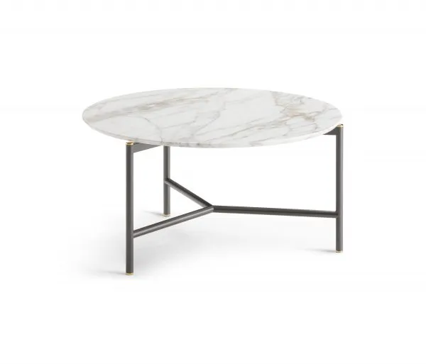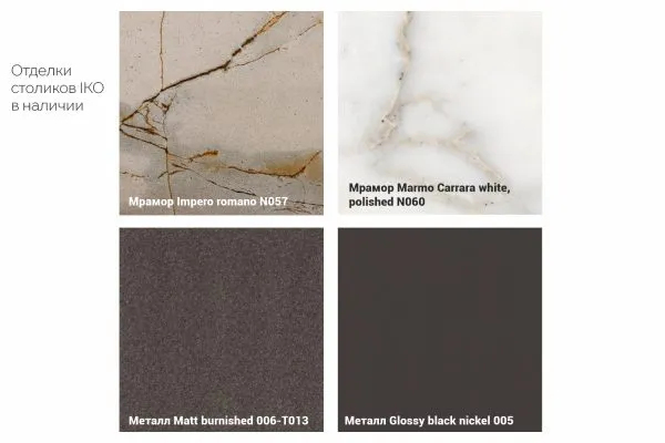 Столики Iko отличаются роскошными материалами и стильными деталями, которые делают их идеальными для любого интерьера. Столики имеют разные высоты и диаметры, отлично смотрятся рядом с диванами и креслами, также используются как тумбочки. Основа изготовлена из железа в отделке вороненый матовый с деталями из глянцевого золота или глянцевого черного никеля. В столиках высотой 55 см цилиндрические насадки на ножки представлены в двух вариантах: глянцевое золото или глянцевый черный никель, в столиках высотой 47,5 см предусмотрены насадки на ножки в виде кнопки в таких же вариантах отделки. Столешница выполнена из мрамора.