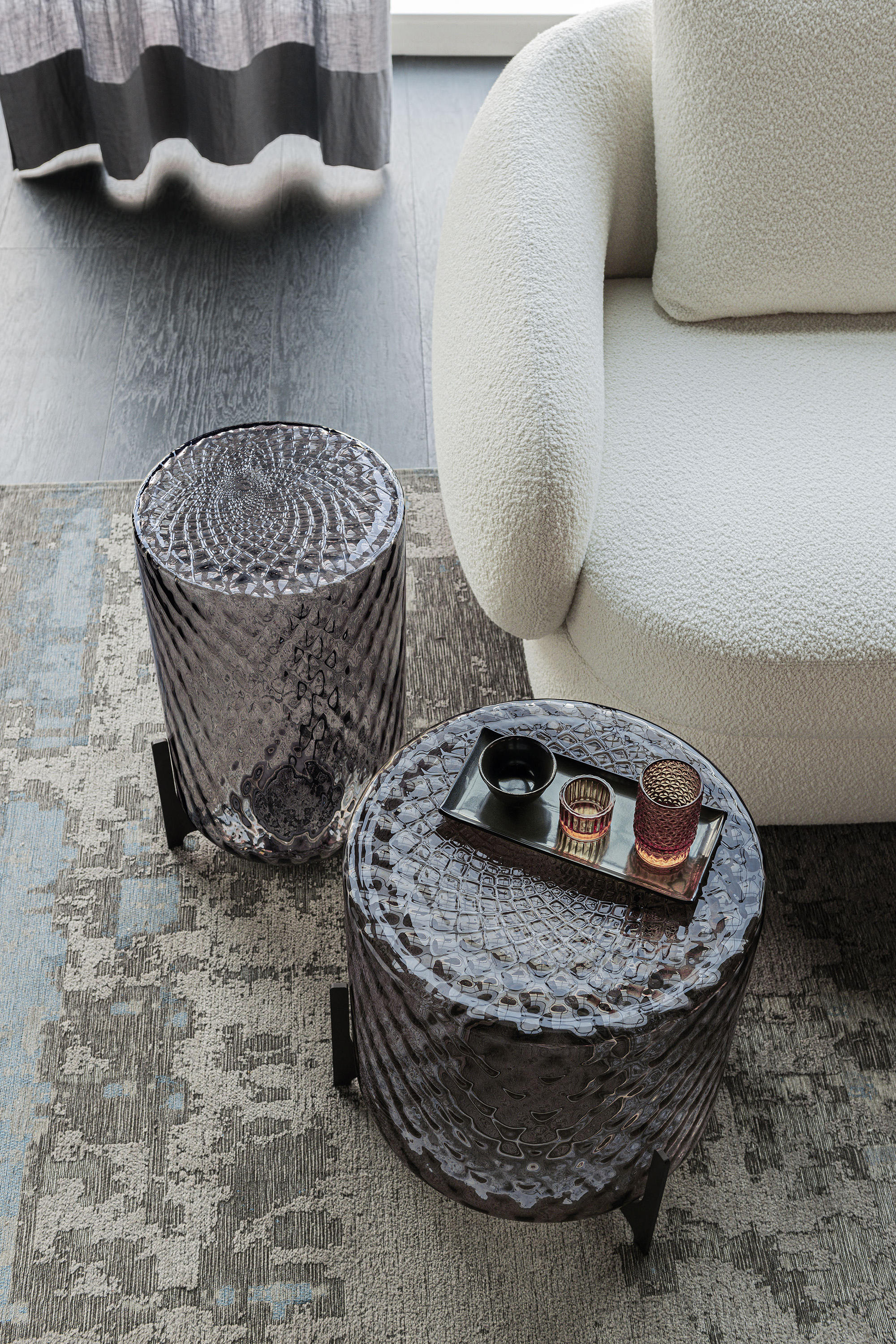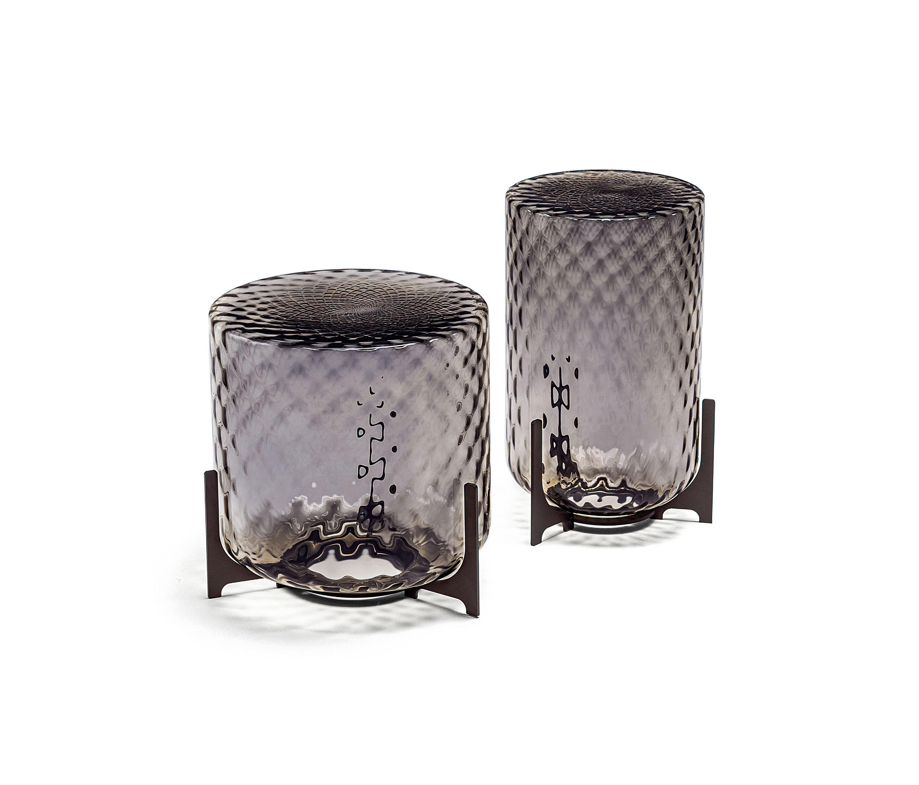 Корпус стеклянного журнального столика Dodo украшен трехмерным рисунком из перекрещивающихся ромбов, полученным по металлической форме. В результате выдувания наконечники внутри формы придают форму расплавленному стеклу и создают характерный эффект огранки, характерный для процесса balloton. В верхней части выполнен узор в виде мандалы, слегка смещенный от центра в месте соединения ромбов формы, создавая узор, напоминающий лепестки цветов или идеальные узоры буддийской традиции, с помощью которых природа выражает свое великолепие.