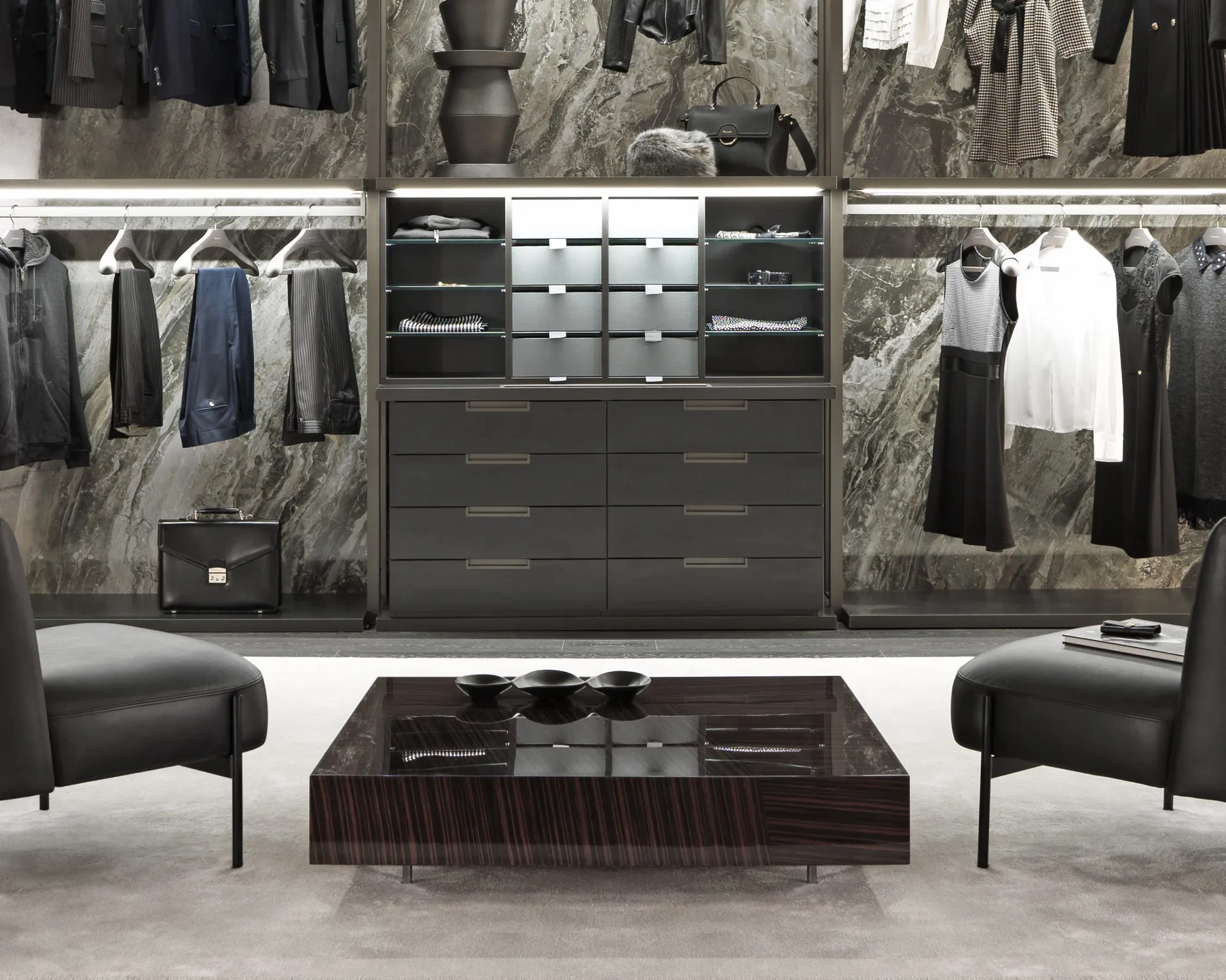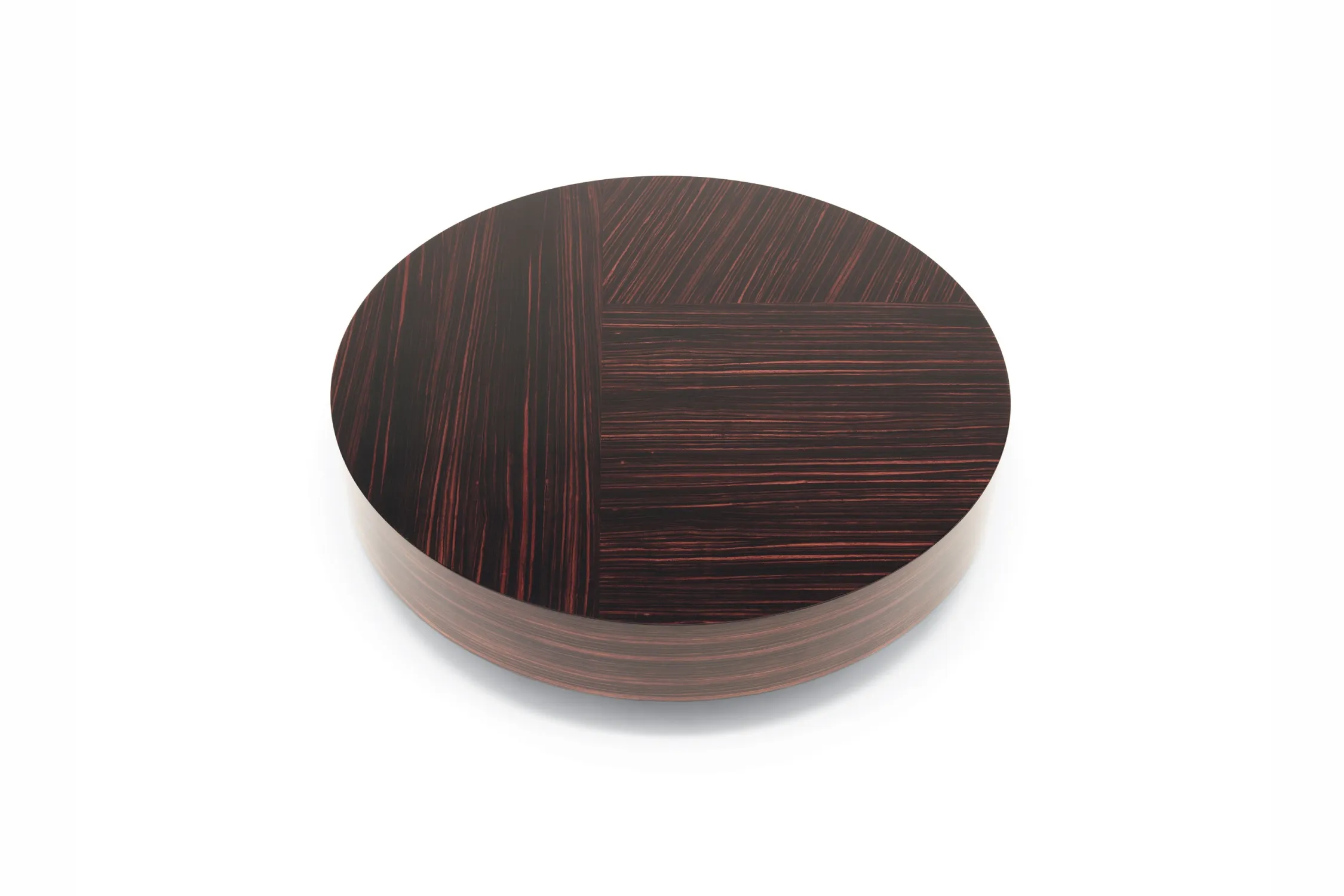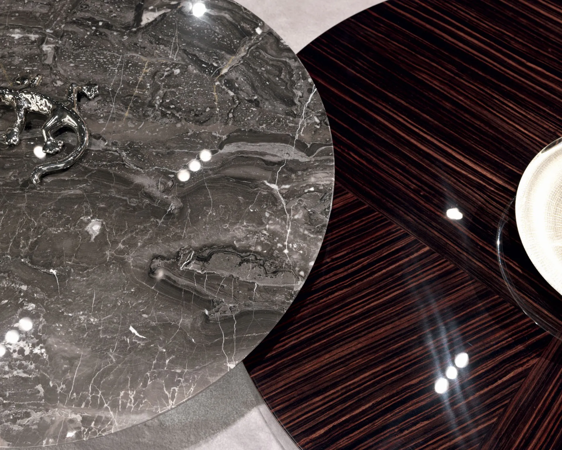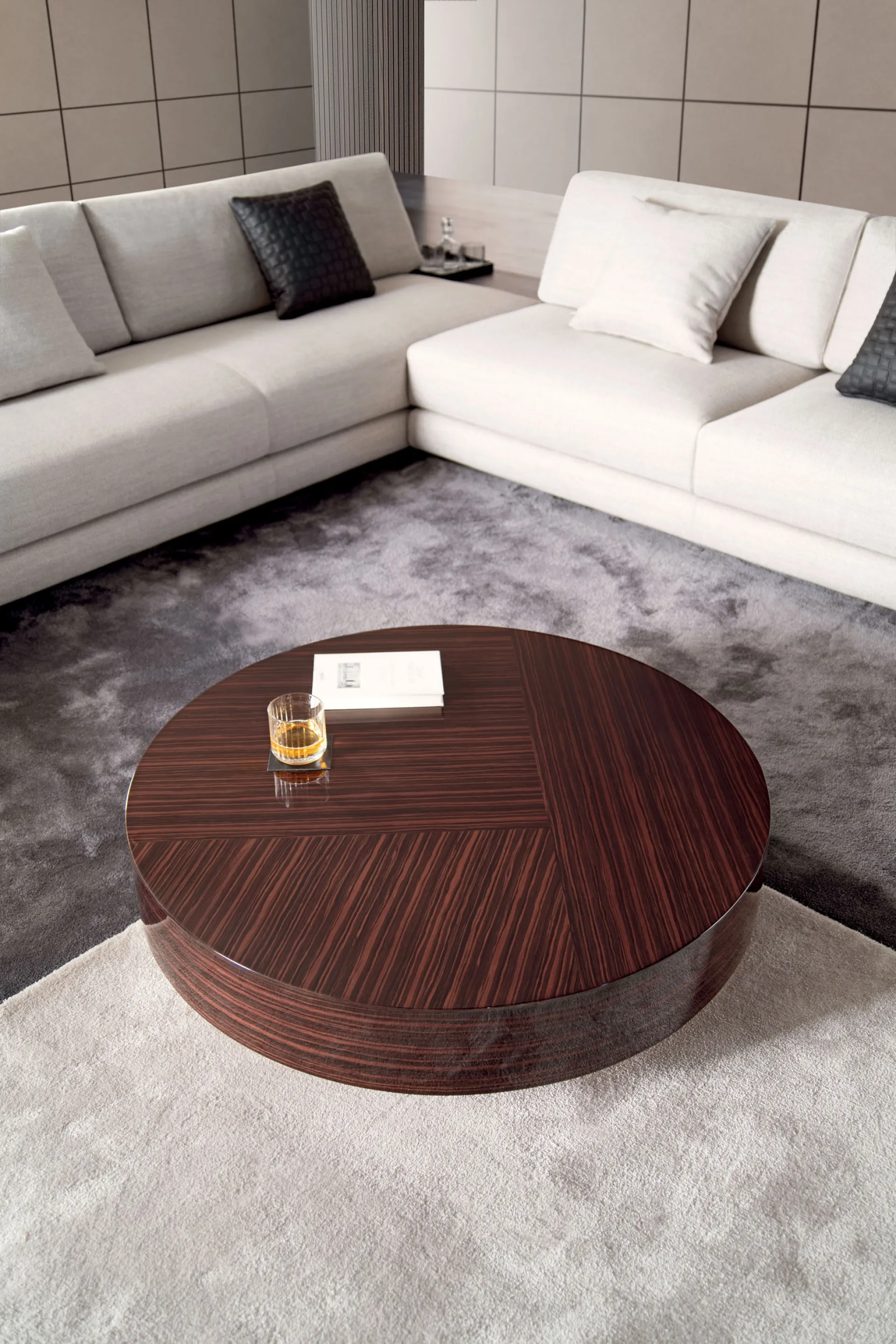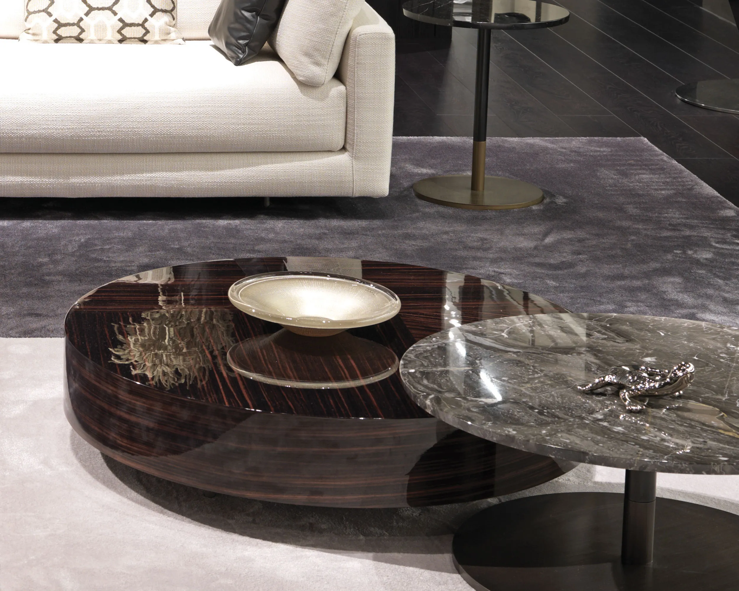 Мебельная коллекция Gemini от MisuraEmme представляет собой журнальные столики с простыми формами и сложными деталями. Они сочетают теплую текстуру и узор древесины макассара с гладкими геометрическими линиями. Выбор доступен между круглой и квадратной формой столика, а отделка может быть глянцевой или матовой. Красивые низкие ножки выполнены в цвете оружейного металла. Главной особенностью столиков Gemini является то, что каждая столешница создается с уникальным шпоном, выбранным по индивидуальному эскизу, с акцентом на особенности рисунка эбенового дерева.